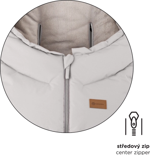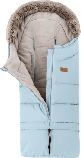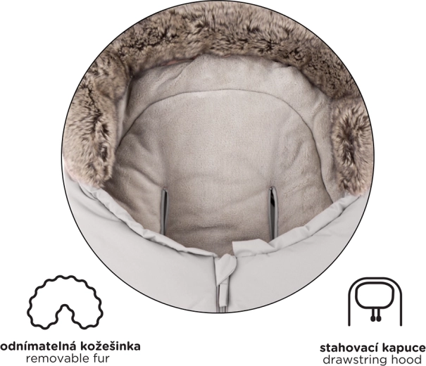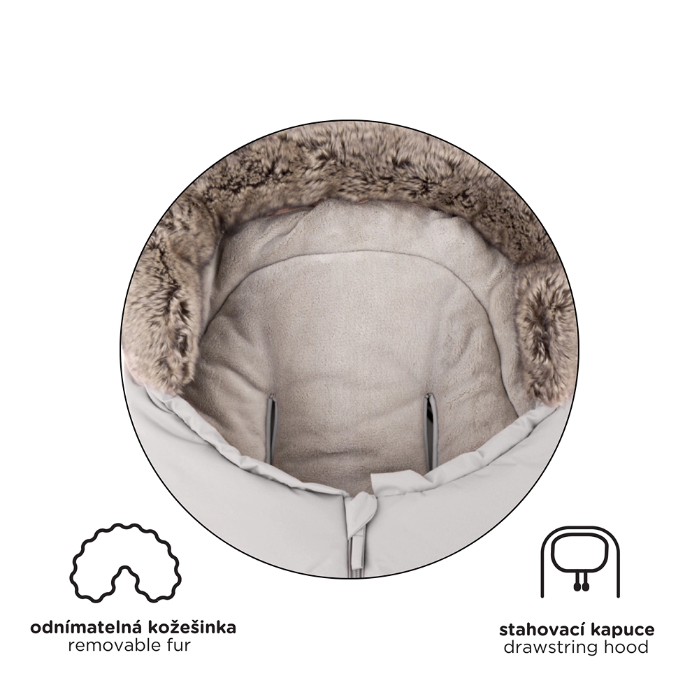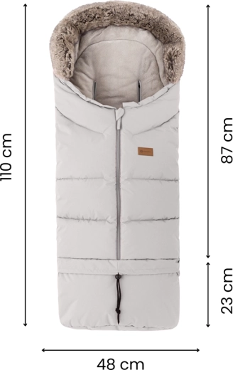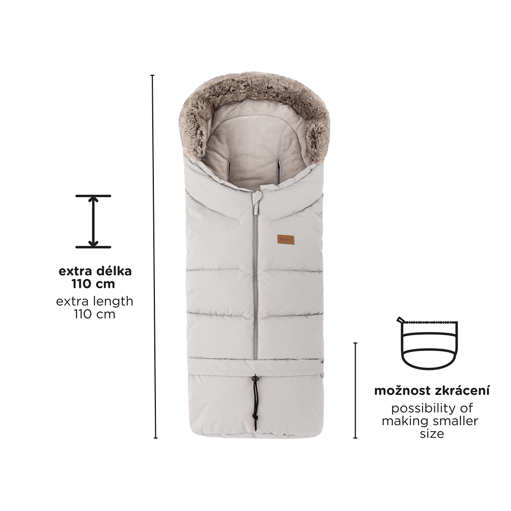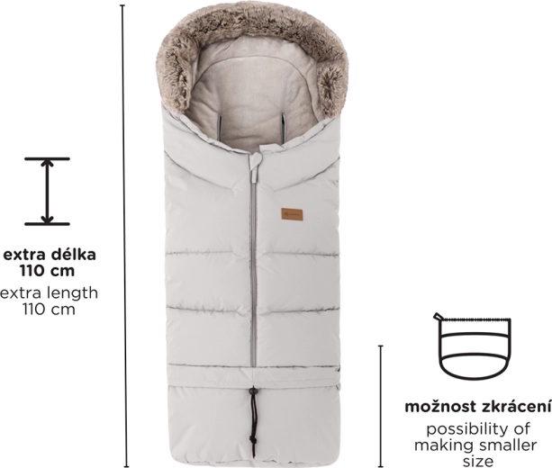 Sacul se scurtează ușor prin desprinderea părții inferioare pentru landou sau scaun auto, iar la lungimea completă de 110 cm este ideal pentru căruciorul sport. Gulerul din blăniță servește drept protecție împotriva vântului.
