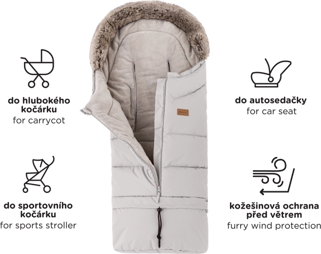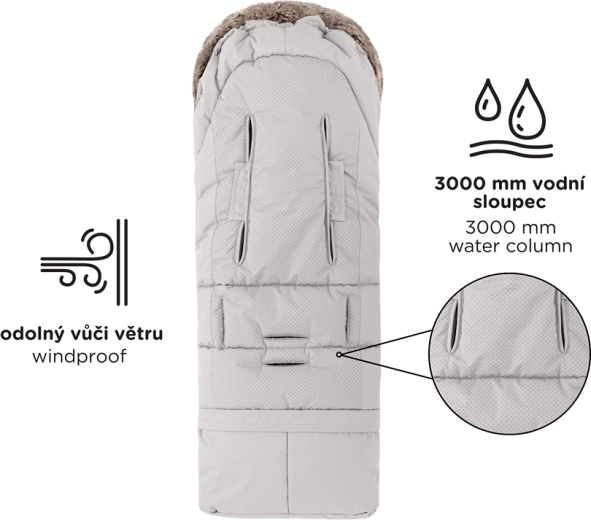 Datorită soluției 4în1, sacul poate fi folosit în landou, cărucior sport și scaun auto. Fantele verticale și cele 6 treceri universale pentru centuri asigură compatibilitate largă. Partea inferioară detașabilă, din material lavabil, este ideală pentru ghetuțe murdare. Mănușile Furry se prind pe orice mâner de cărucior cu ajutorul capselor rezistente, au fleece călduros, tratament hidrofug și mărime universală potrivită și pentru tați.
