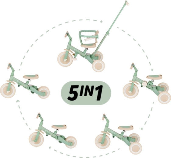 - 5 moduri într-unul: tricicletă împinsă, tricicletă–bicicletă de echilibru, tricicletă cu pedale, bicicletă de balans, bicicletă cu pedale