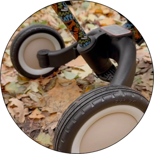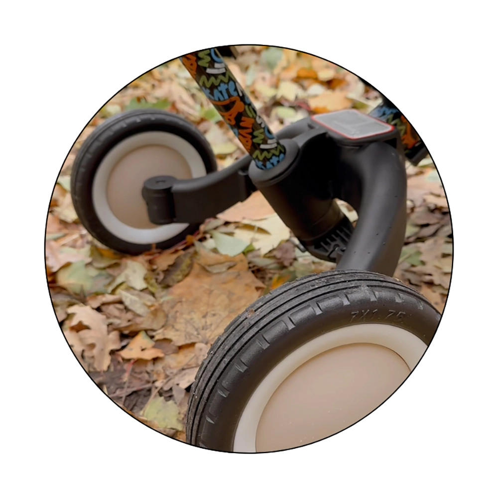 Mânerele antiderapante, șaua reglabilă cu centuri și roțile din cauciuc rezistente oferă stabilitate și încredere acasă, în parc și pe trotuar.