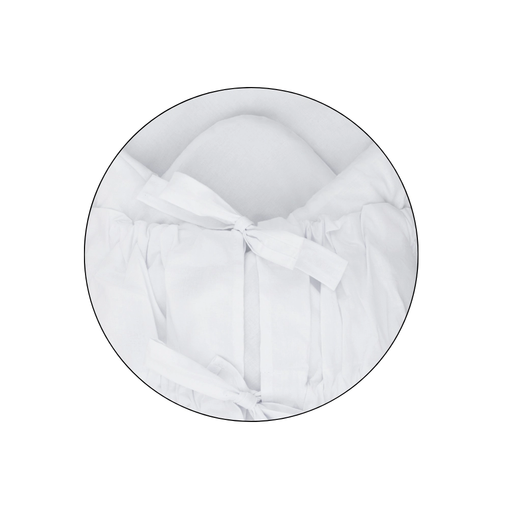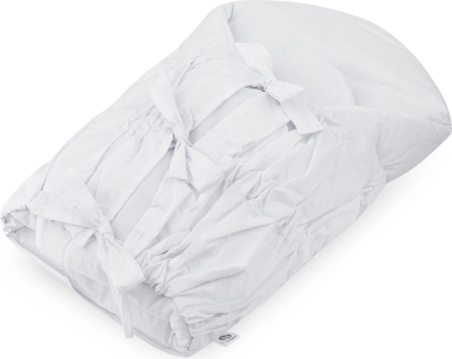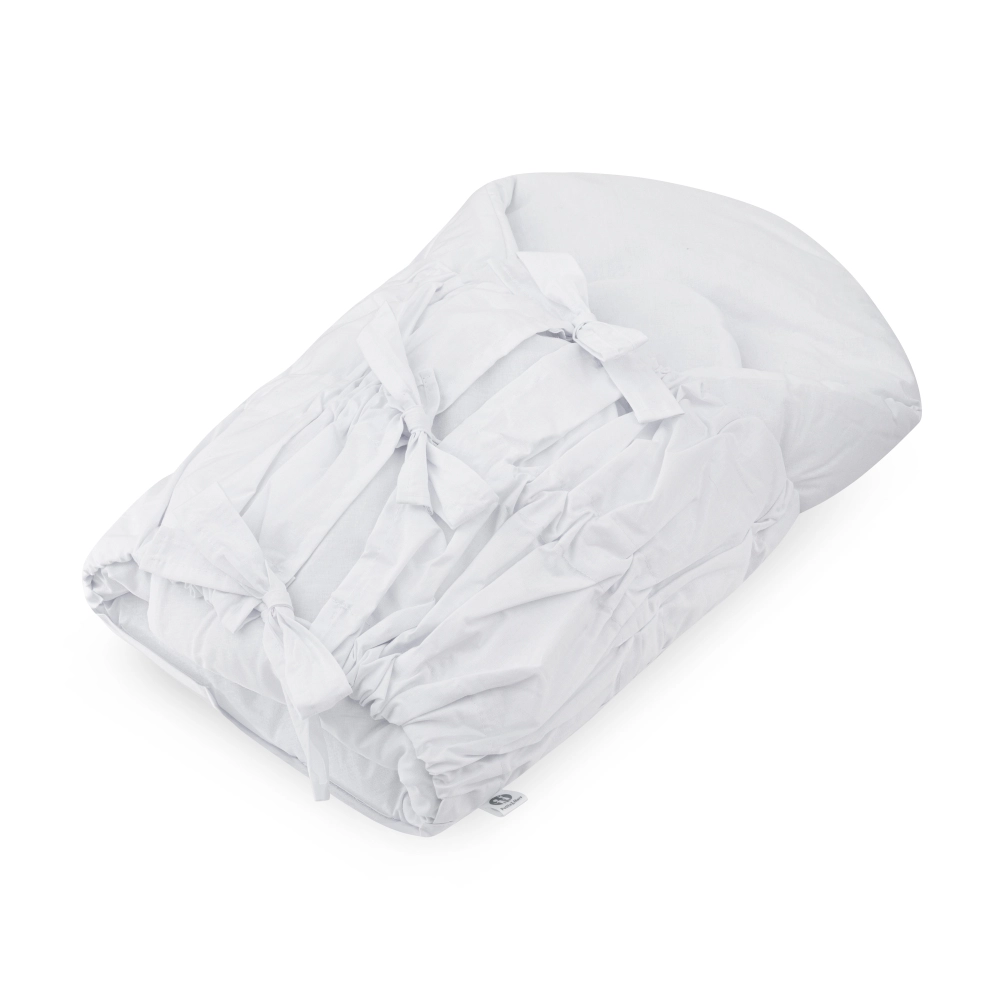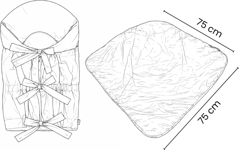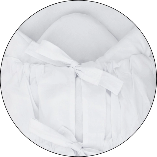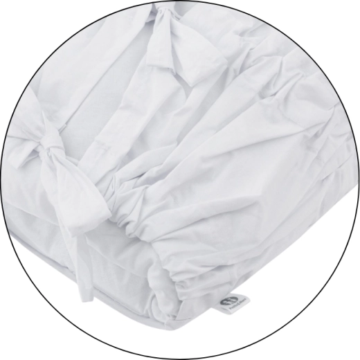 Husa din 100% bumbac moale este blândă cu pielea sensibilă și oferă o căldură plăcută. Închiderea cu panglici permite strângerea ușoară și fermă, pentru o senzație de siguranță „ca în burtica mamei”. Întotdeauna scoateți inserția de cocos înainte de spălare.