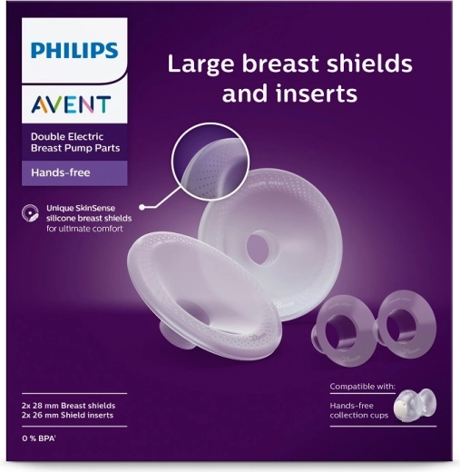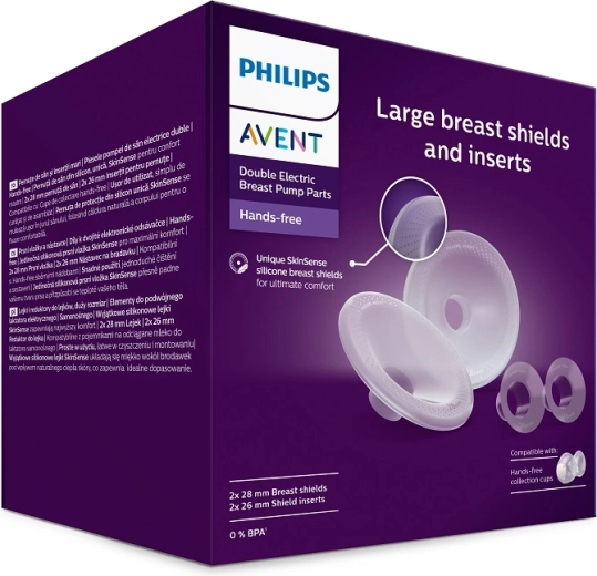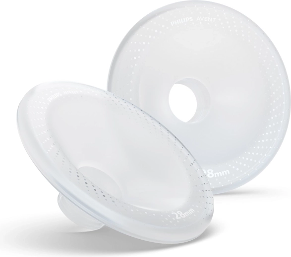 Ușurați pomparea cu inserțiile și cupele compatibile Philips AVENT pentru pompele hands-free. Setul oferă două dimensiuni (cupă 28 mm, inserție 26 mm) pentru puratre confortabilă și sigură, extracție eficientă și curățare ușoară. Siliconul moale se adaptează delicat la forma sânului și susține un ritm natural de pompare, asemănător suptului bebelușului.