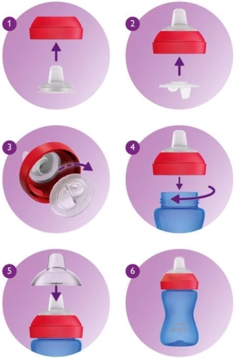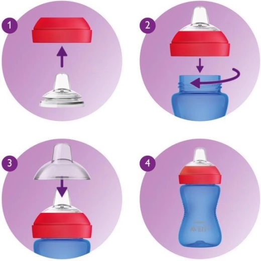 Practicul capac igienic menține gurița curată acasă și în deplasare. Toate componentele se demontează ușor și pot fi spălate în mașina de spălat vase. Cana este fabricată din material sigur fără BPA (0% BPA) și este compatibilă cu biberoanele Philips Avent Classic și Natural (cu excepția celor din sticlă).
