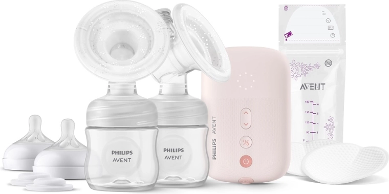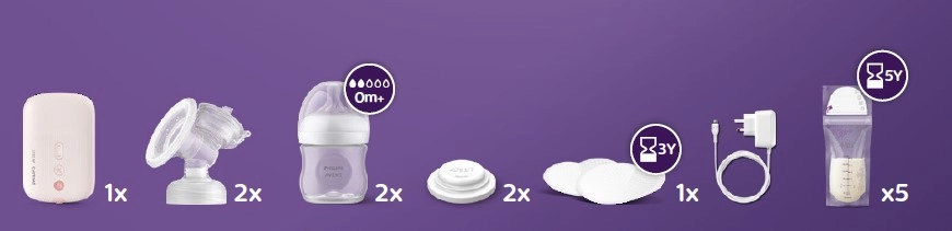 - 2 unități de pompare cu pernuțe, 2 biberoane cu capace și tetine, unitate de control, pungi pentru lapte, tampoane pentru sâni