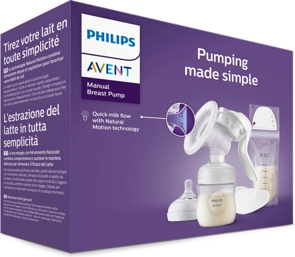 Pompă manuală pentru sân Philips Avent cu tehnologia Natural Motion care combină faza de sucțiune și stimulare inspirată de alăptarea bebelușului pentru un flux rapid de lapte. Datorită insertului din silicon moale și adaptabil, pomparea este confortabilă fără aplecare, iar ritmul și intensitatea se reglează ușor. Compactă, portabilă și ușor de curățat și asamblat – ideală pentru pompare ocazională acasă și în deplasare.