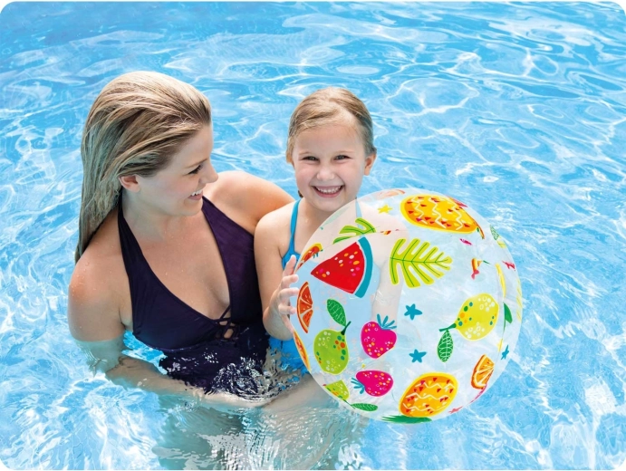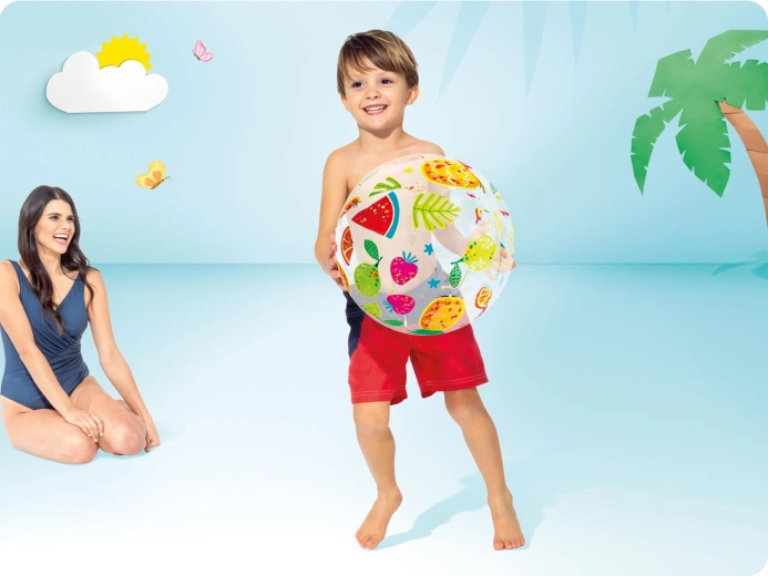 Bucurați-vă la maximum de vară cu mingea de plajă Intex cu imprimeu vesel cu fructe. Se vede excelent pe nisip și în apă, este ușoară și compactă – când este dezumflată ocupă minimum de spațiu în geantă. Materialul din vinil rezistent asigură durabilitate și joacă fără griji.