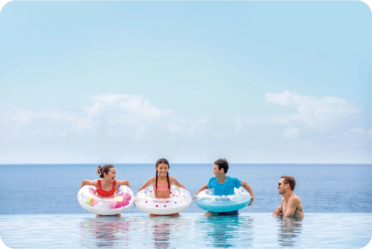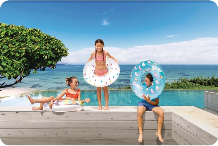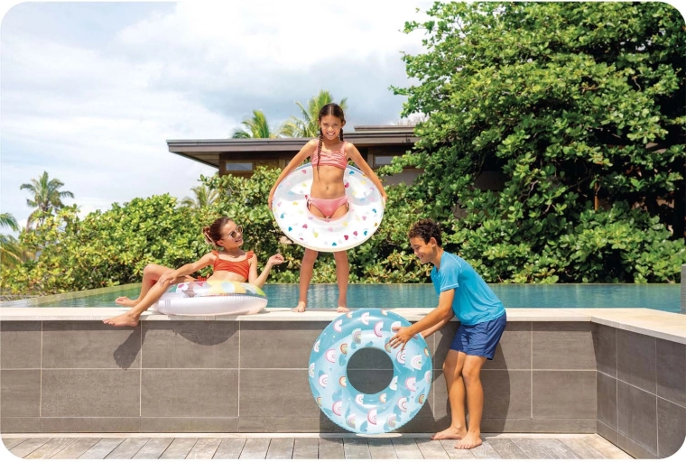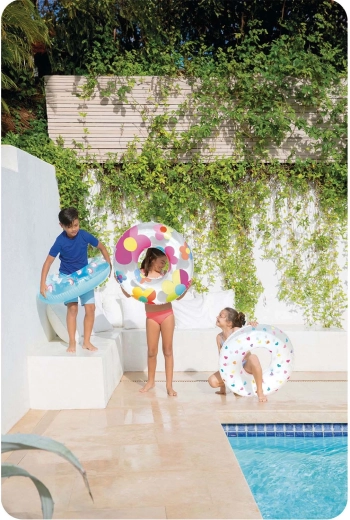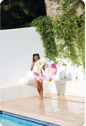 Supapa practică permite umflarea și dezumflarea rapidă. Suprafețele lucioase din PVC se șterg ușor și rămân curate chiar și după o zi întreagă la piscină.