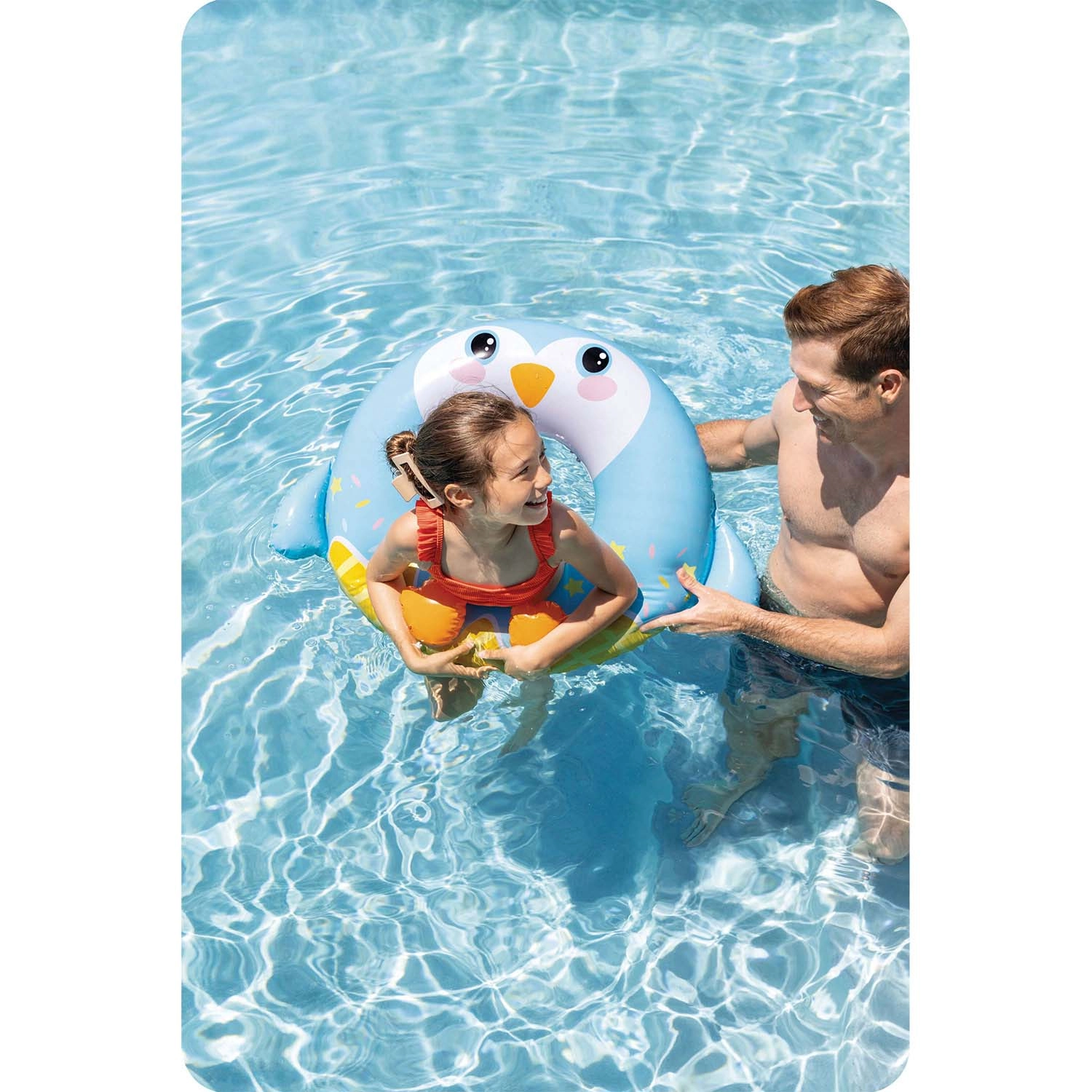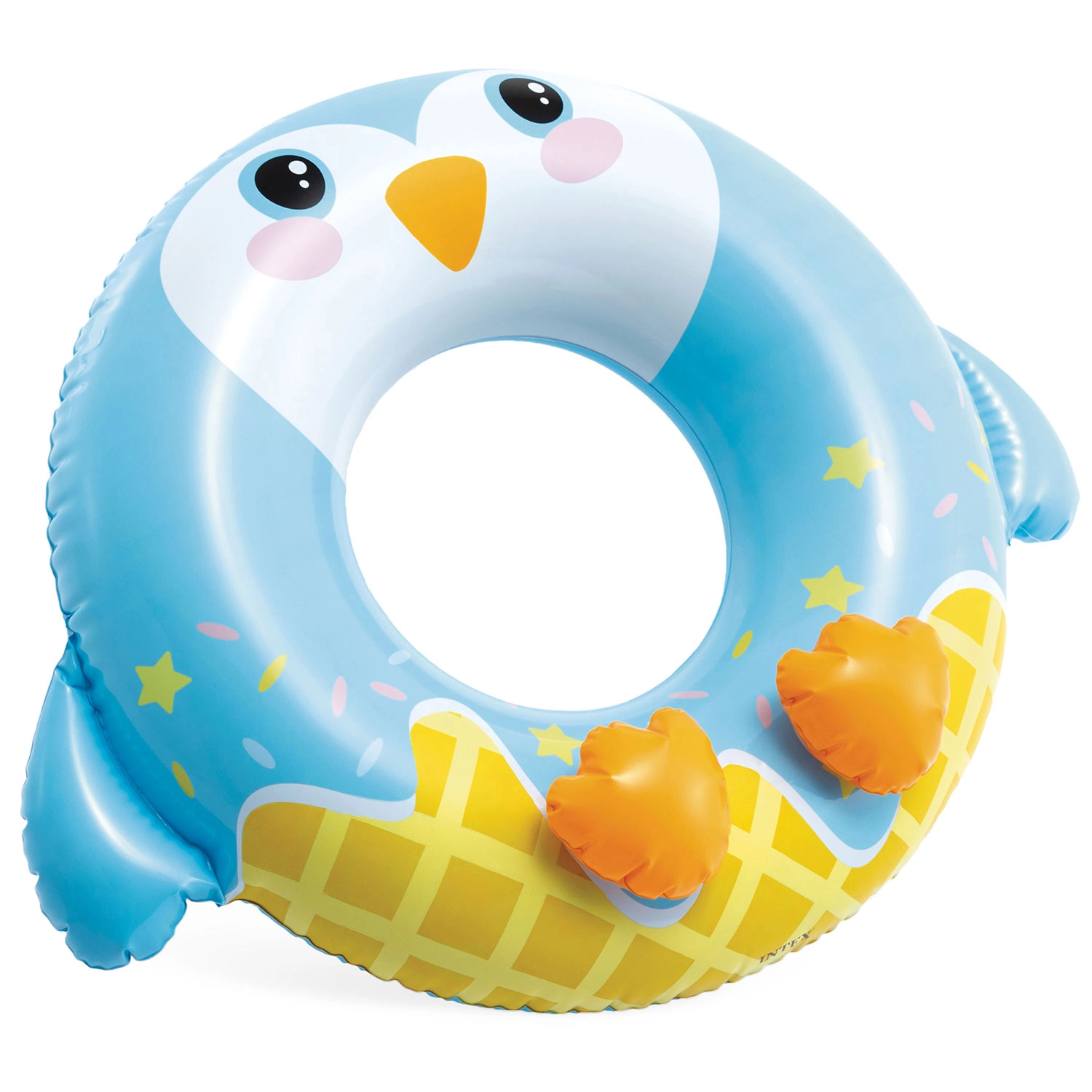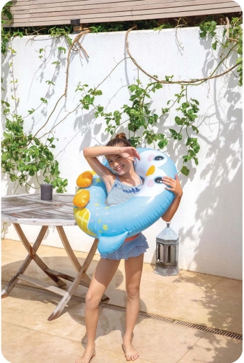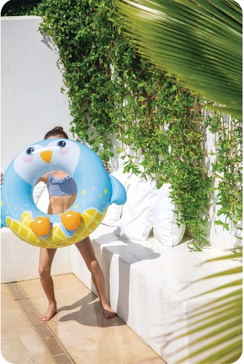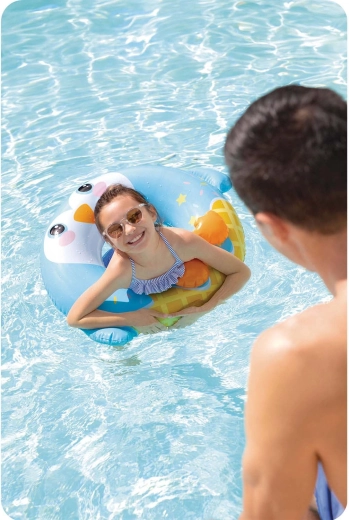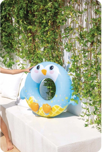 Designul vesel cu steluțe și „picioarele” pinguinului va cuceri copiii, în timp ce părinții vor aprecia capacitatea de încărcare sigură de până la 40 kg și vârsta recomandată de la 8 ani. Colacul se umflă și se dezumflă ușor și, datorită dimensiunilor compacte, se depozitează fără probleme în geantă.