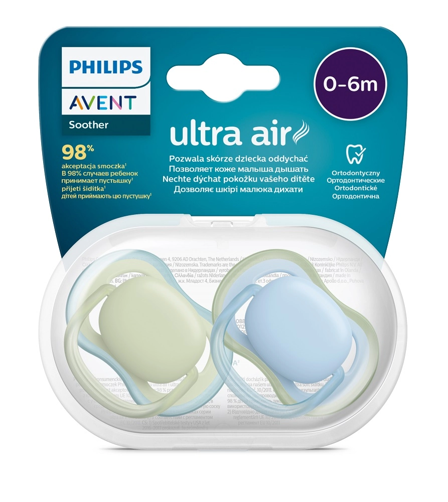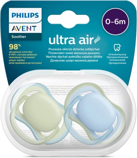 Philips Avent Ultra Air este concepută pentru o liniștire blândă și o piele a bebelușului mai sănătoasă. Orificiile extra-mari din scut asigură o circulație mai bună a aerului, astfel pielea din jurul gurii rămâne mai uscată și mai puțin iritată. Construcția ușoară și inelul ergonomic facilitează manevrarea și prinderea.