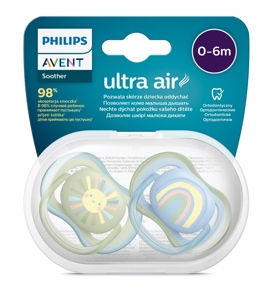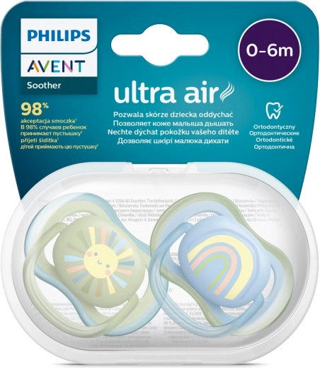 Philips Avent Ultra Air este o suzetă concepută pentru confort maxim al pielii sensibile a bebelușului. Orificiile de ventilație extra-mari ajută la menținerea zonei din jurul gurii aerisită și mai uscată, în timp ce siliconul delicat, simetric și ortodontic susține dezvoltarea corectă a palatului, dinților și gingiilor. Datorită suprafeței texturate, suzeta stă plăcut în gură și oferă o senzație naturală.