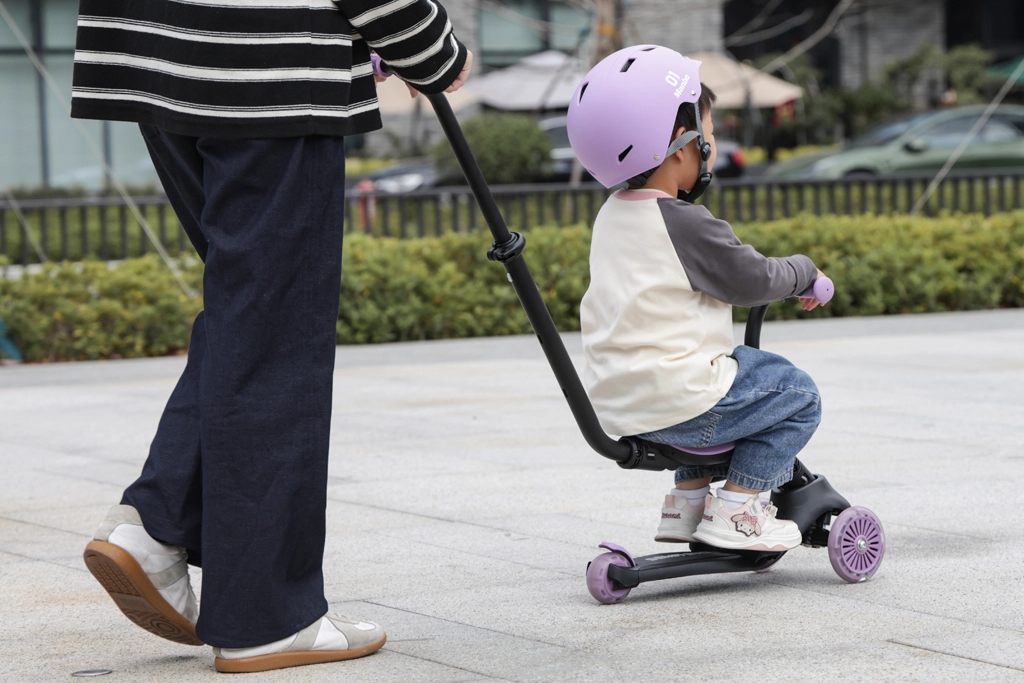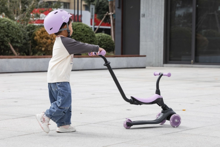 Șeaua detașabilă și mânerul parental permit transformarea rapidă din mersul așezat în trotinetă pentru deplasare independentă, care susține echilibrul și coordonarea.