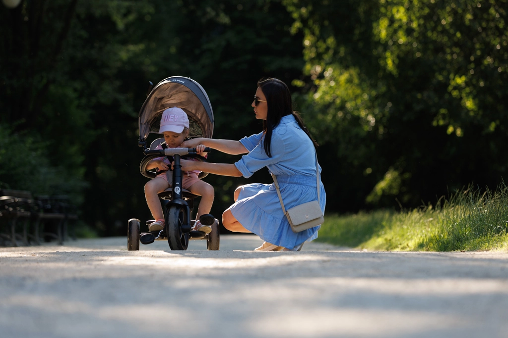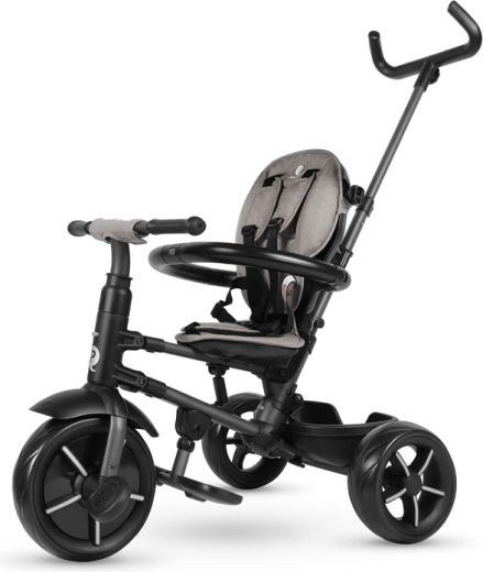 Siguranța pe primul loc: centuri în 5 puncte, bară de protecție detașabilă și copertină extensibilă cu protecție UV UPF 50+ protejează copilul în orice condiții. Funcția de roată liberă și blocarea direcției permit trecerea de la mers asistat la pedalare independentă, în timp ce suportul rabatabil pentru picioare oferă odihnă în plimbările mai lungi.