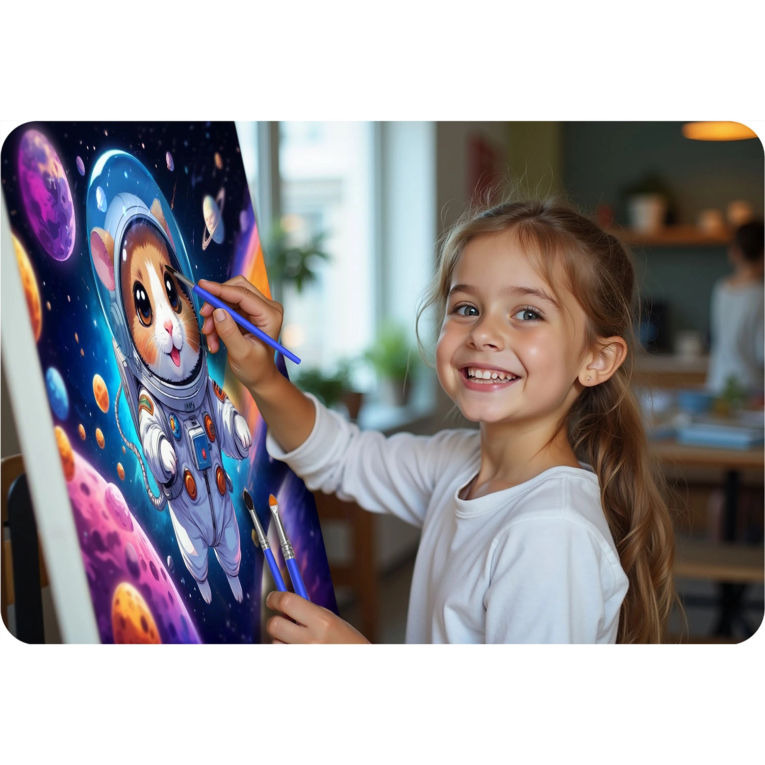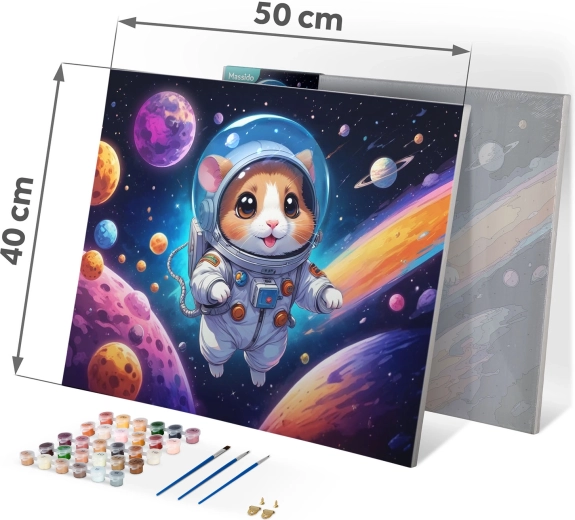 Acest set de pictură după numere oferă tot ce ai nevoie pentru a realiza o imagine captivantă cu un drăgălaș astronaut printre planete. Pânza de înaltă calitate pe șasiu întins este grunduită și are câmpuri preimprimate, discret marcate, pentru a ghida ușor pensula. Fundalul colorat facilitează orientarea și ajută la obținerea unor rezultate intense chiar și pentru începători absoluți.