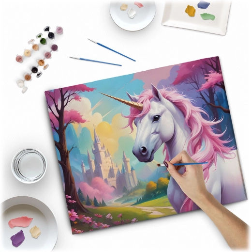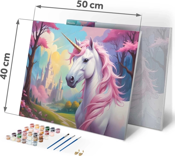 Descoperă farmecul creației cu setul de pictură după numere în dimensiunea 40 × 50 cm. Motivul cu unicorn pe pânză de calitate, întinsă pe șasiu, este pregătit pentru pictură. În set găsești 30 de culori acrilice opace, 3 pensule gratuite de dimensiuni diferite și agățătoare pentru suspendare. Grundul colorat cu model fin ușurează pictura chiar și pentru începători și garantează un rezultat frumos, intens.