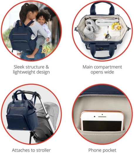 SKIP HOP Mainframe Midnight Navy combină țesătura moale cu un design elegant sportiv și oferă vizibilitate maximă datorită deschiderii extra late cu cadru. În interior găsești o compartimentare inteligentă care păstrează toate esențialele pentru copii și părinți perfect organizate – de la scutece și hăinuțe până la telefon, chei sau sticla cu apă.