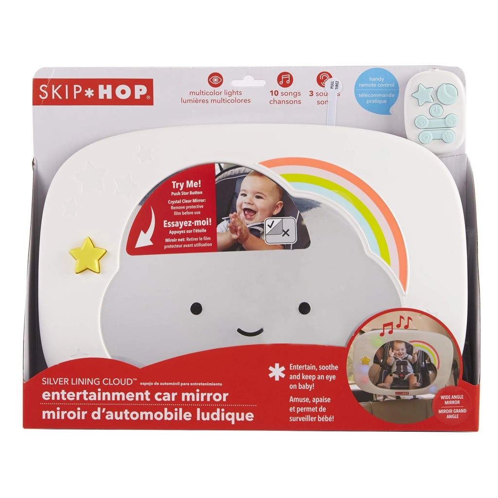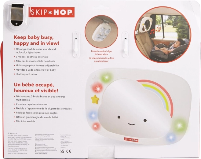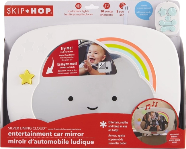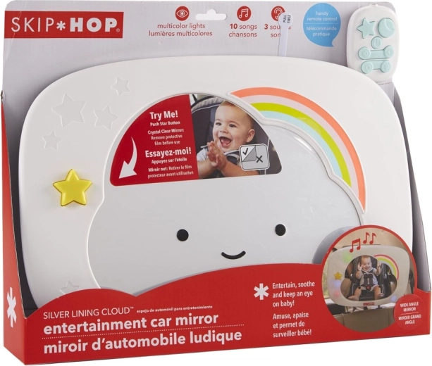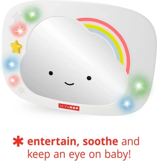 Drăgălașa oglindă pentru scaunul auto în formă de nor de la SKIP HOP îi ajută pe părinți să își supravegheze bebelușul și, în același timp, să îl distreze și liniștească. Oferă lumini LED multicolore, muzică și zgomot alb, telecomandă cu clips și un unghi larg de vizualizare datorită suprafeței mari, curbate a oglinzii și balama articulată multiunghi.