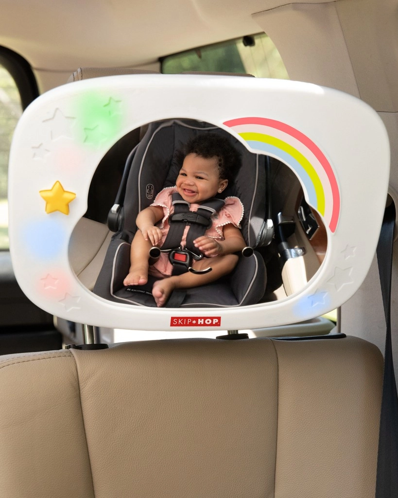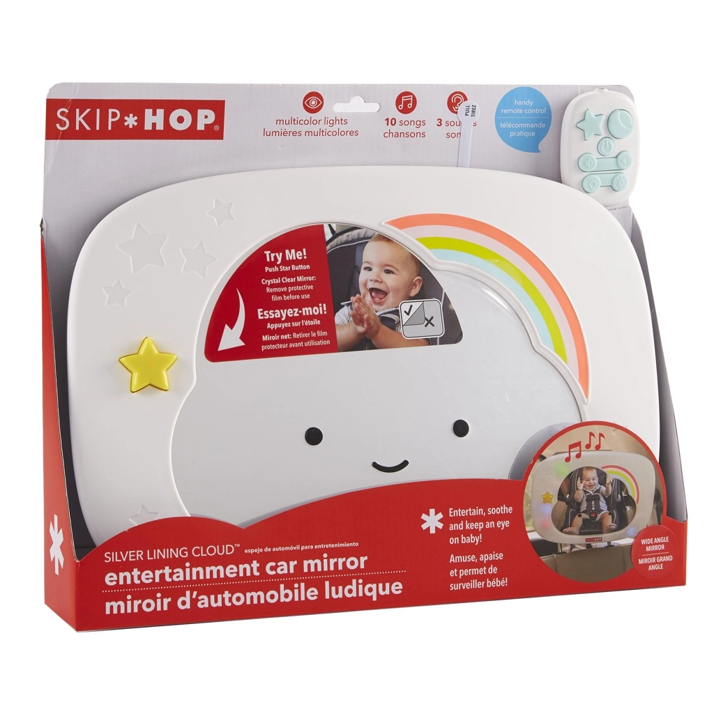 Bucurați-vă de călătorii mai liniștite datorită oglinzii retrovizoare inteligente SKIP HOP Silver Lining Cloud. Suprafața mare, ușor curbată oferă un unghi larg de vizualizare asupra copilului în scaunul orientat cu spatele la direcția de mers, în timp ce efectele luminoase, 10 melodii și 3 sunete de zgomot alb asigură o stimulare vizuală și auditivă delicată. Totul este ușor de controlat cu telecomanda cu clips, pe care o puteți prinde de parasolar.