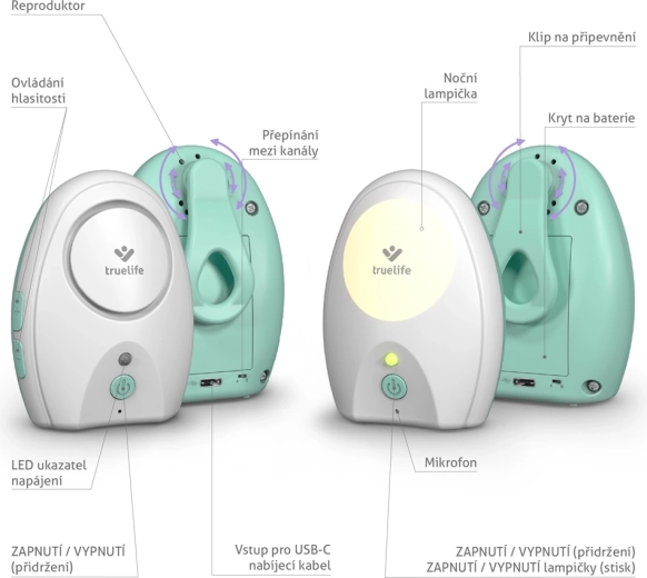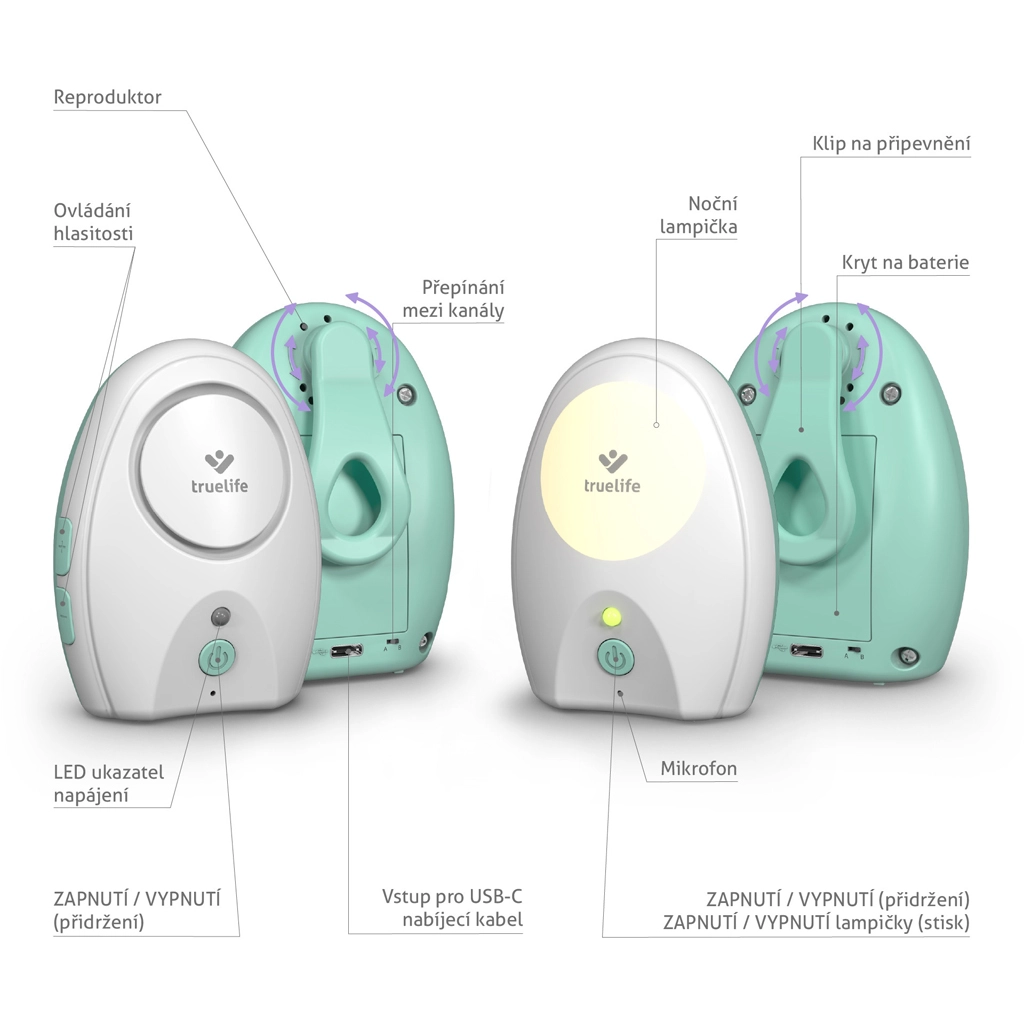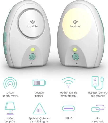 TrueLife NannyTone VM Pocket este un monitor audio digital compact, proiectat pentru siguranță și confort. Transmisie stabilă pe două canale de frecvență, rază de acțiune de până la 700 m în spațiu deschis și alertă de pierdere a semnalului doar pe unitatea părintelui, astfel încât bebelușul să nu fie deranjat. Bateriile reîncărcabile în ambele unități și alimentarea universală USB‑C îți permit să iei monitorul oriunde – acasă, la țară sau în călătorii.