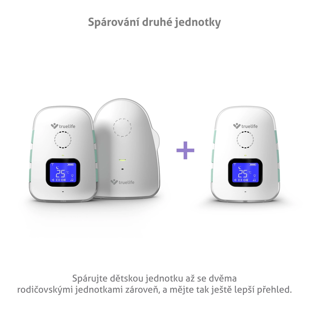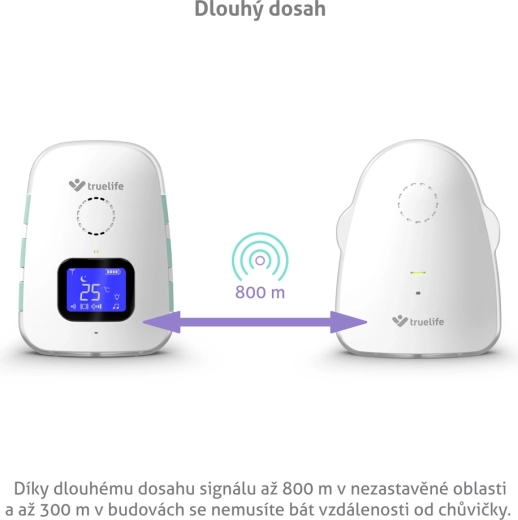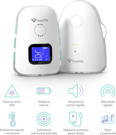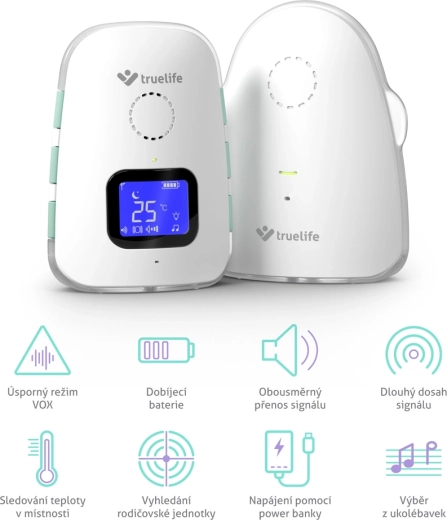TrueLife NannyTone VM3 este un monitor audio digital de încredere pentru o supraveghere neîntreruptă a camerei copilului. Transmisie audio stabilă și sigură, cu rază de până la 800 m în spațiu deschis și până la 300 m în clădiri, completată de modul sensibil VOX, care activează dispozitivul doar la detectarea sunetului, economisind astfel bateria. Datorită comunicării bidirecționale puteți liniști bebelușul de la distanță și alege din 8 cântece de leagăn cu volum ajustabil.