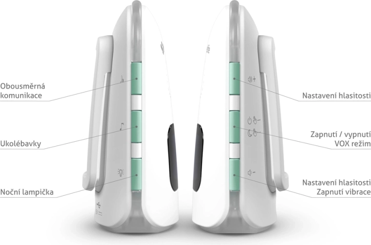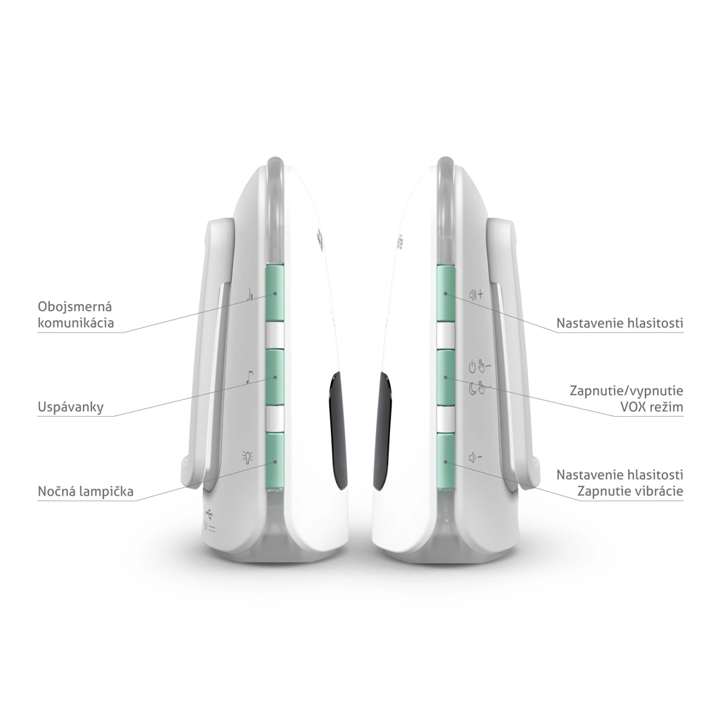 - Mod VOX, detecție pierdere semnal, comunicare bidirecțională, senzor de temperatură (alarmă temperatură ridicată/scăzută), detecție baterie descărcată, setare sensibilitate alarmă, vibrații, mod silențios, reglare volum, lampă de noapte, locator sonor pentru unitatea părintelui, cântece de leagăn