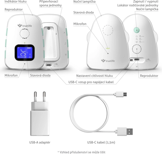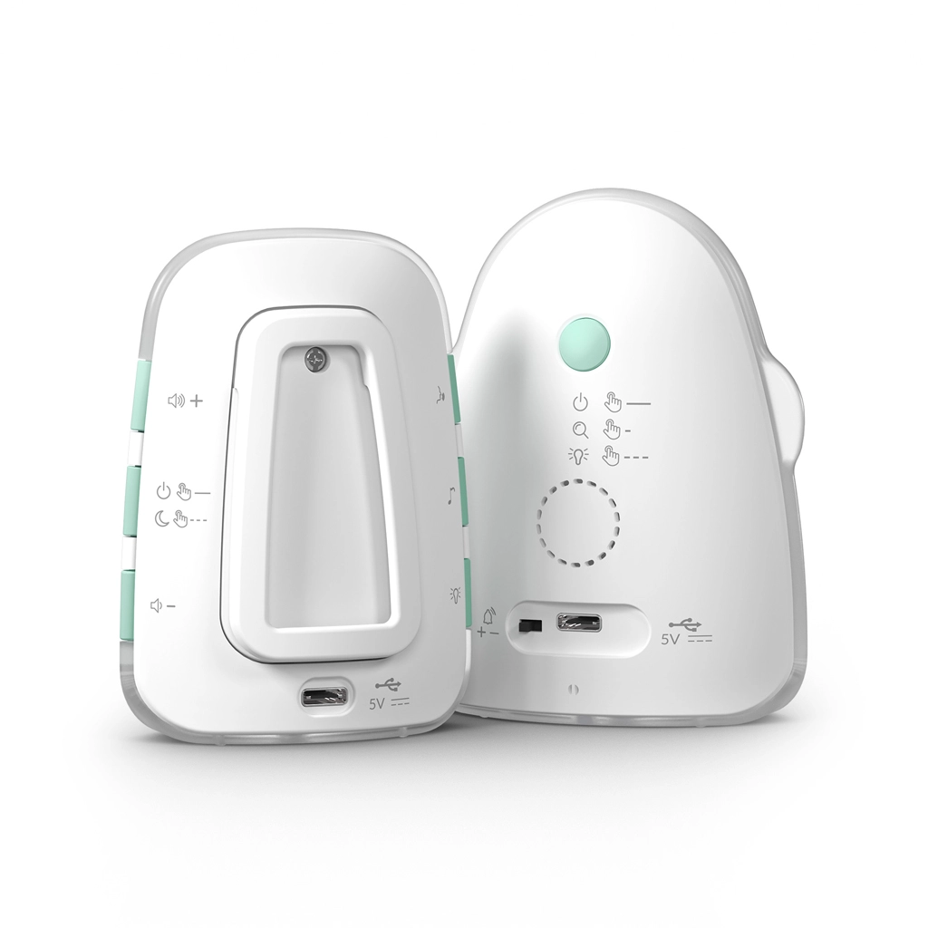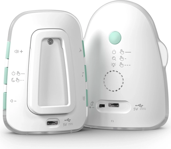 Unitatea pentru părinți cu ecran LCD afișează temperatura, nivelul bateriei și puterea semnalului. Sunt incluse monitorizarea temperaturii cu alerte la temperaturi scăzute sau ridicate, mod silențios cu vibrații, lampă de noapte practică și locator sonor pentru unitatea părintelui. Ambele unități au baterii integrate cu autonomie îndelungată și încărcare comodă prin USB‑C, inclusiv de la o baterie externă.