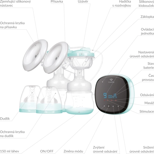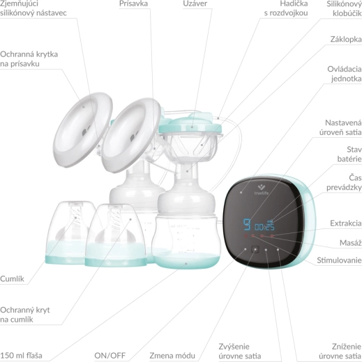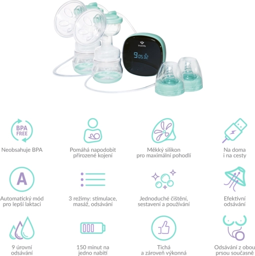 Controlul este simplu datorită ecranului LED cu butoane tactile și temporizatorului practic. Alegeți dintre 3 moduri – stimulare, masaj și extracție – și dintre 9 niveluri de intensitate pentru confort maxim. Construcția ușoară, dimensiunile compacte și bateria cu autonomie de până la 150 de minute fac din această pompă un ajutor ideal acasă și în călătorii. Adaptatoarele fine din silicon, cu margine flexibilă, și materialele fără BPA asigură siguranță pentru dumneavoastră și bebeluș.