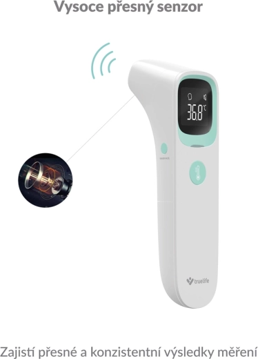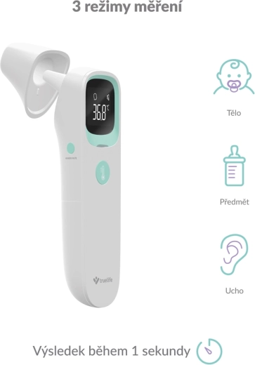 TRUELIFE Care Q9 este un termometru infraroșu modern, fără contact, care măsoară temperatura în 1 secundă cu o precizie ridicată. Datorită celor trei moduri, poate măsura temperatura corporală de pe frunte și din ureche, precum și temperatura obiectelor și a lichidelor – ideal pentru laptele praf al bebelușilor, baie sau băuturi. Indicatorul color de pe ecran avertizează instantaneu asupra temperaturii crescute, chiar și pe întuneric.
