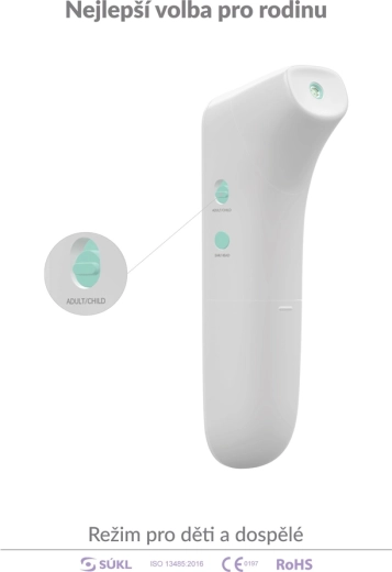 Pentru familiile cu copii există modul pentru copii pentru persoanele sub 12 ani. Măsurarea este complet igienică și confortabilă – este suficient să îndreptați de la o distanță de 1–3 cm și să apăsați un singur buton. Termometrul memorează ultimele 20 de valori și, datorită funcționării economice, poate realiza până la 20 000 de măsurători cu un singur set de baterii.