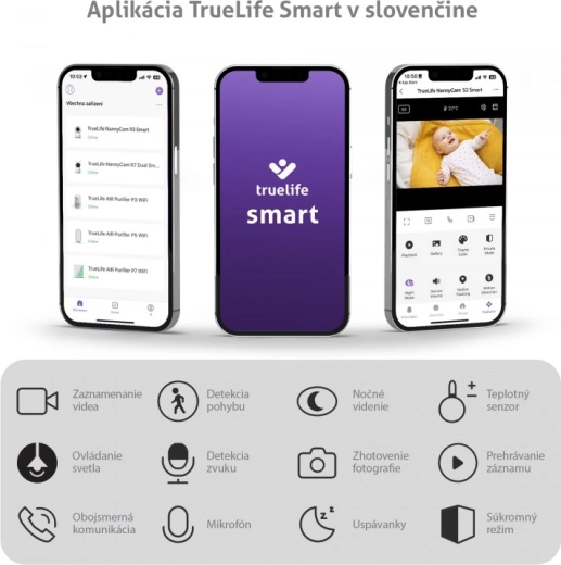 Monitorul funcționează prin aplicația sigură TrueLife Smart (localizare în limba cehă) cu protecție în cinci straturi și criptare AES. Obțineți rază de acțiune nelimitată de oriunde din lume, posibilitatea de a conecta până la 16 camere și un număr nelimitat de utilizatori. Este disponibil înregistrarea fotografiilor și videoclipurilor pe card microSD. Suportul flexibil permite fixarea aproape oriunde – de exemplu, pe rama pătuțului.