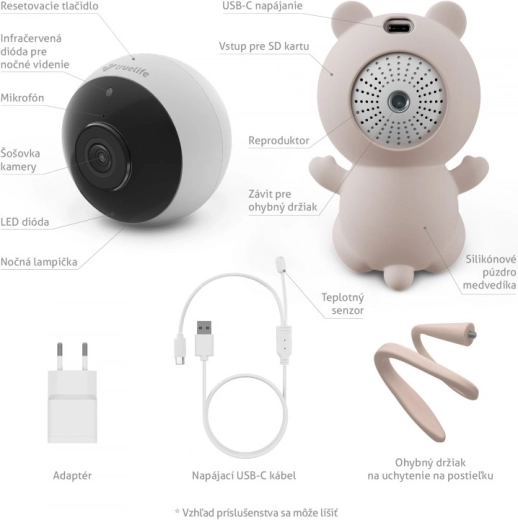 - Cameră inteligentă NannyCam S3, husă din silicon în formă de ursuleț, cablu USB‑C cu senzor de temperatură, adaptor de alimentare, suport flexibil pentru pătuț, manual și instrucțiuni de siguranță, ac pentru resetare