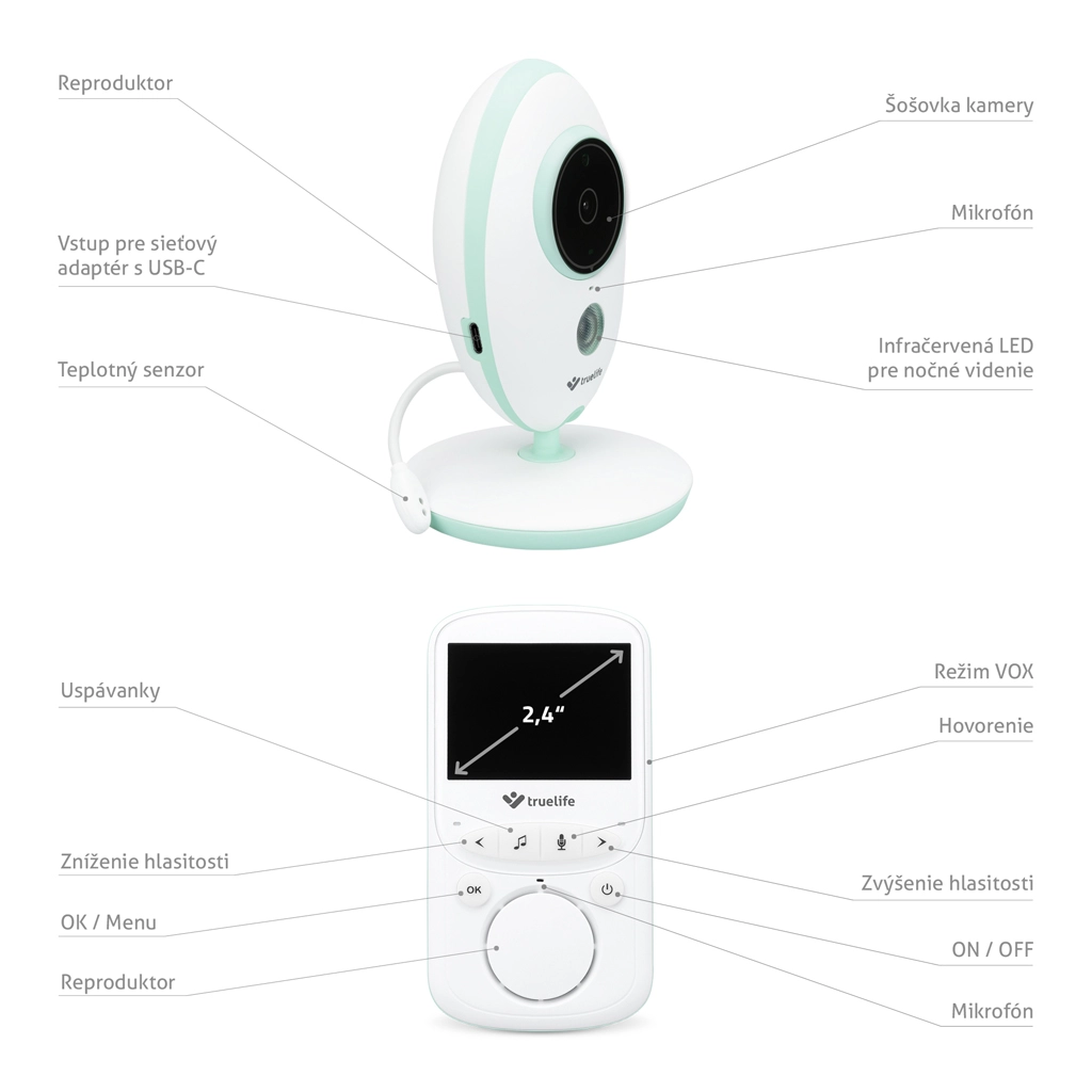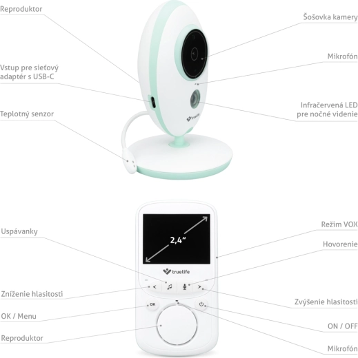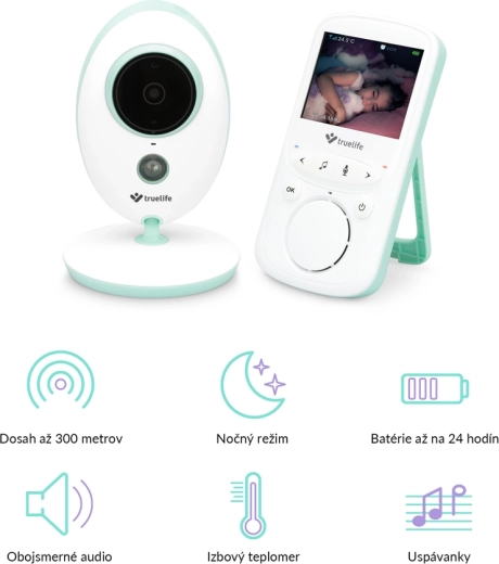 Monitorul video digital TRUELIFE NannyCam V24 Pro oferă imagine clară zi și noapte, un LCD color de 2,4", transmisie stabilă pe 2,4 GHz până la 300 m și comunicare bidirecțională. Datorită modului VOX, unitatea pentru părinți rezistă pe baterie până la 24 de ore. Include viziune nocturnă, măsurarea temperaturii ambientale, cântece de leagăn și modernul încărcare USB‑C cu suport pentru power bank.