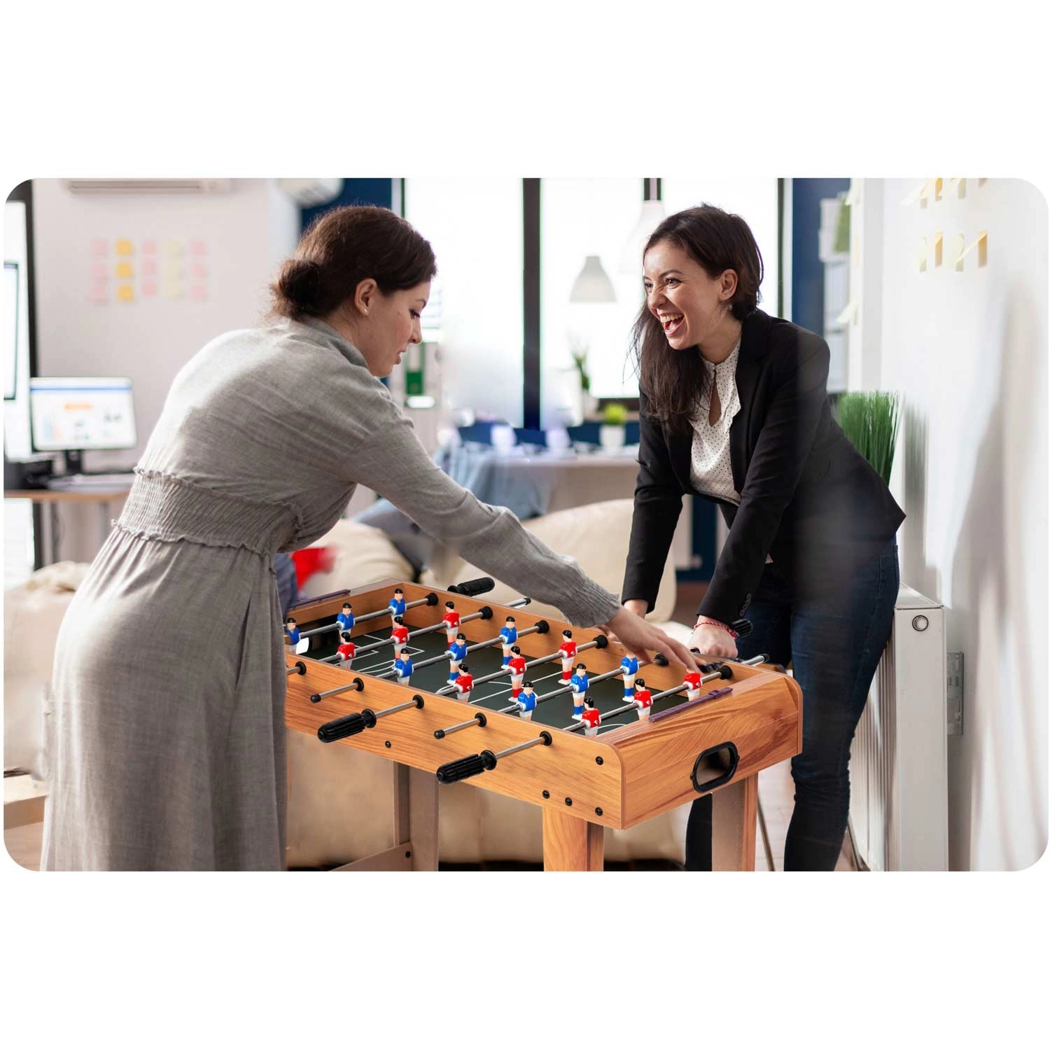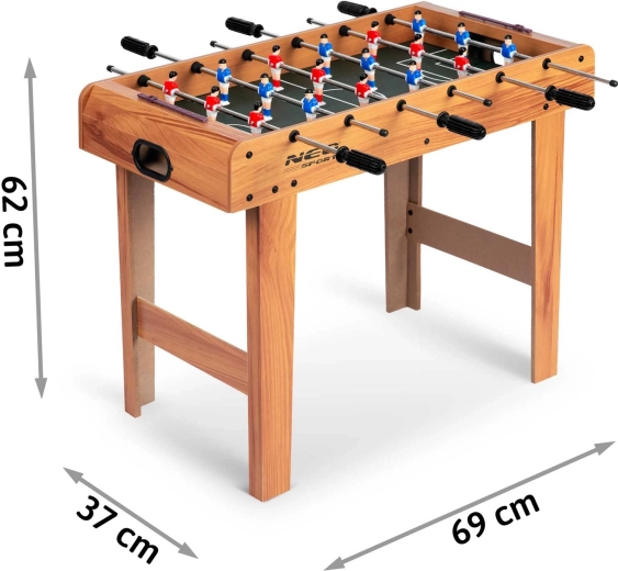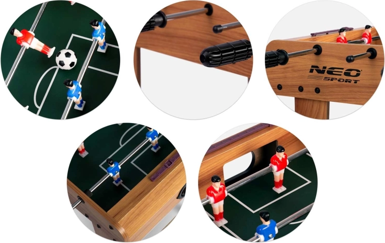 Bucurați-vă de distracție atemporală oricând și oriunde. Masa de foosball NEO SPORT din lemn, cu dimensiuni compacte, se potrivește în majoritatea spațiilor interioare și, datorită construcției stabile, oferă un joc cursiv și dinamic. Mingi bine echilibrate, prindere sigură și tije de ghidare fluide garantează precizie și control asupra mingii atât în atac, cât și în apărare.