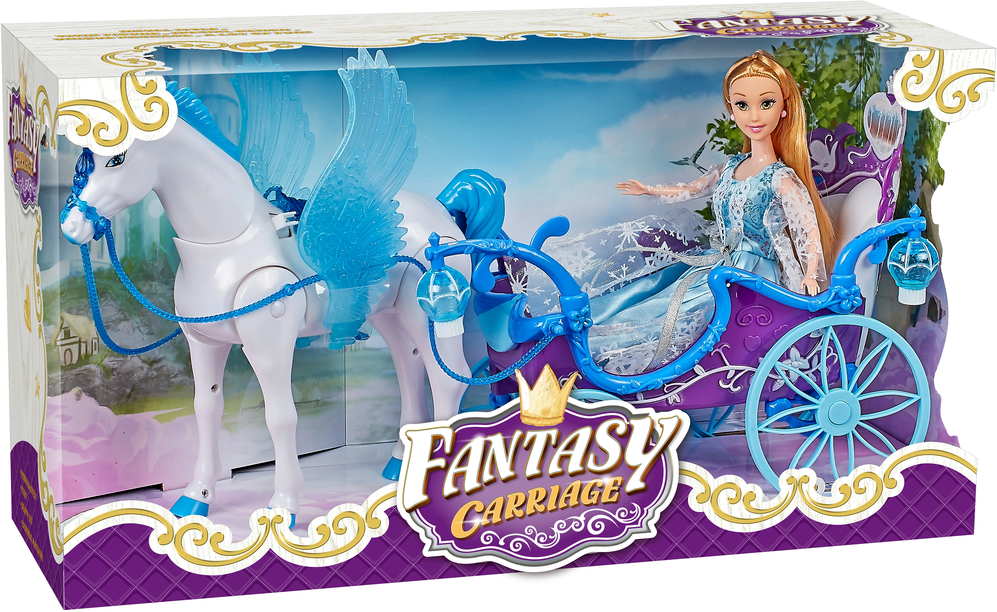 Descoperă lumea fermecată cu caleașca magică albastră, Pegas și păpușă, care oferă efecte luminoase și sonore, design de basm și manevrare ușoară pentru nenumărate momente de joacă creativă.