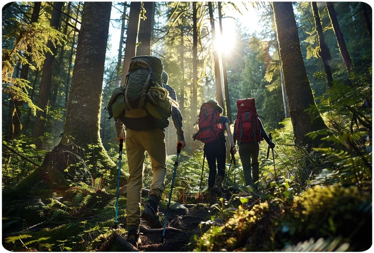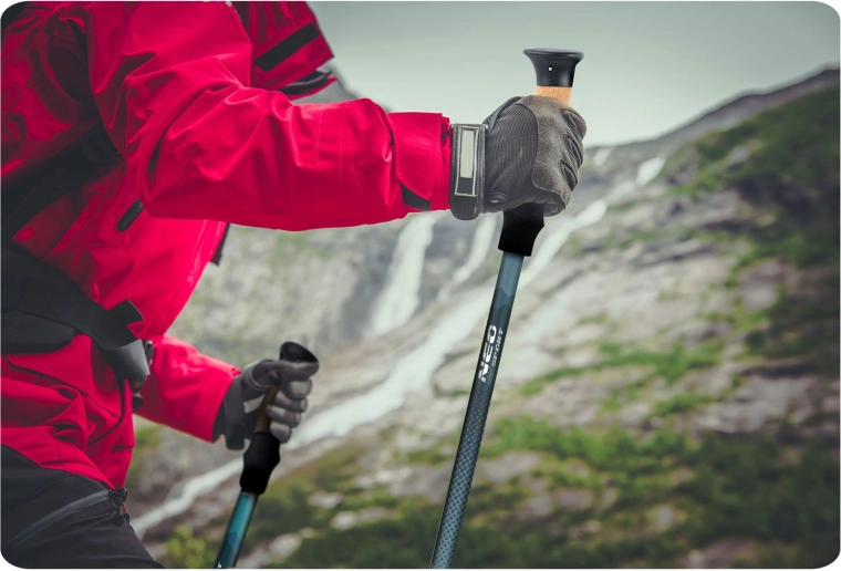 Pluta respirabilă menține palmele uscate și confortabile, iar chinga ajustabilă ușurează priza și reduce oboseala în drumeții lungi.