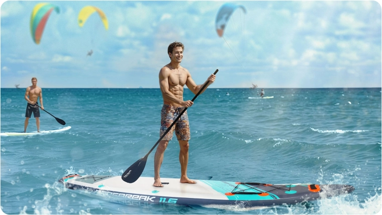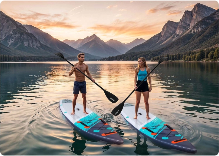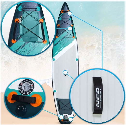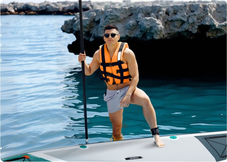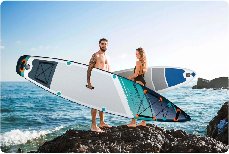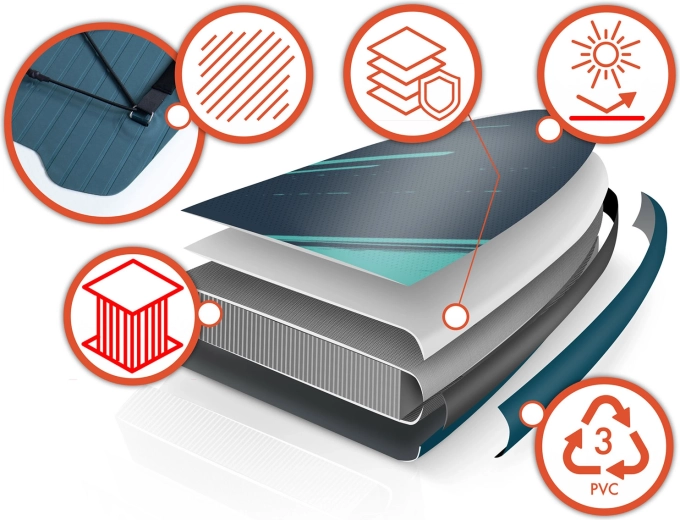 Construcția Drop Stitch Light cu PVC în trei straturi, ranforsare cu fibră de carbon pe margini și cusături întărite îmbină greutatea redusă (aprox. 14 kg) cu rigiditate ridicată și rezistență la UV. EVA antiderapant este plăcut pentru picioarele goale, nu alunecă și absoarbe șocurile. Cargo bungee elastic frontal fixează în siguranță rucsacul sau prosopul, valva etanșă menține presiunea în mod fiabil, iar în pachet este inclusă și cheia pentru aerisire.
