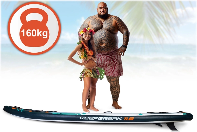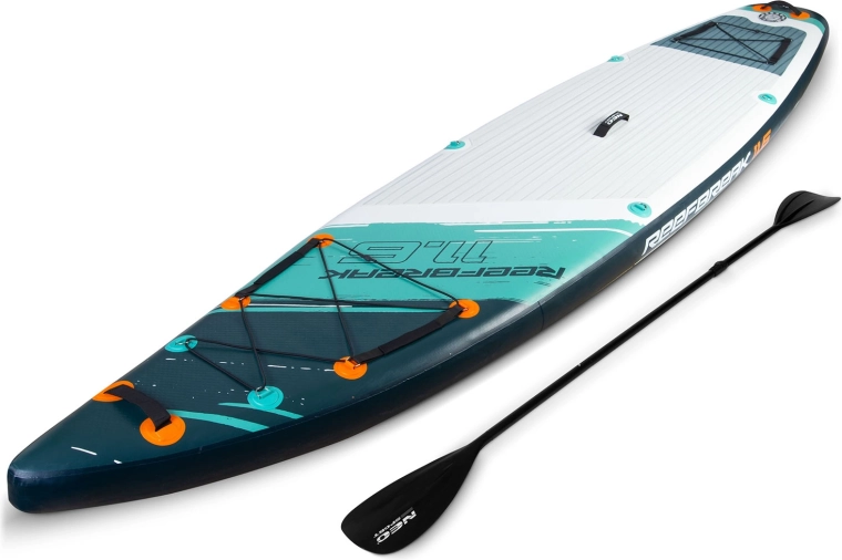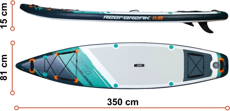 Reefbreak 350 × 81 × 15 cm este un SUP all‑round premium pentru ape calme și valuri mici. Datorită lățimii de 81 cm oferă o stabilitate excelentă pentru începători, în timp ce lungimea de 350 cm ajută la o alunecare mai bună și stabilitate direcțională pe distanțe mai lungi. Capacitate maximă 160 kg și volum de 332 l permit transportul comod al echipamentului sau al unui partener. Cinci mânere de transport practice ușurează manipularea pe mal și din apă.