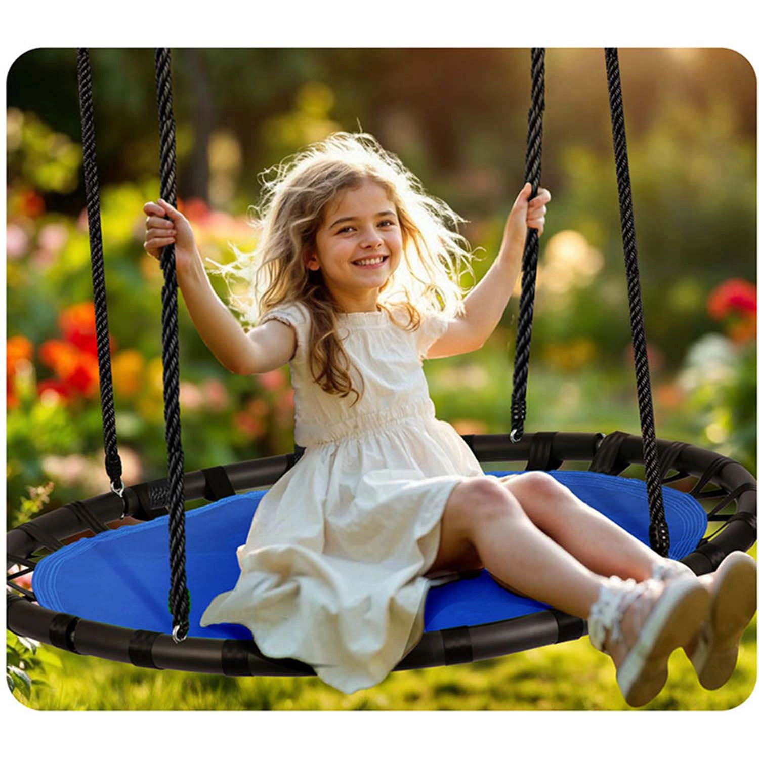 Frânghii puternice, cu reglare lină a lungimii până la 160 cm, permit adaptarea ușoară a leagănului la utilizatori de înălțimi diferite și la spațiu.