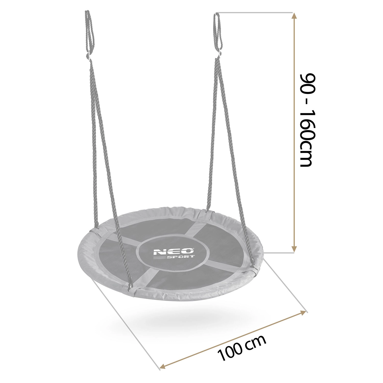 Suspendarea în patru puncte și frânghiile împletite groase asigură stabilitate și siguranță. Înălțimea poate fi reglată cu ușurință în funcție de nevoi și de înălțimea copilului, astfel încât leagănul crește odată cu el. Diametrul generos de 100 cm oferă suficient spațiu pentru ședere și întins, garantând confort maxim.