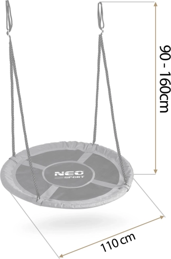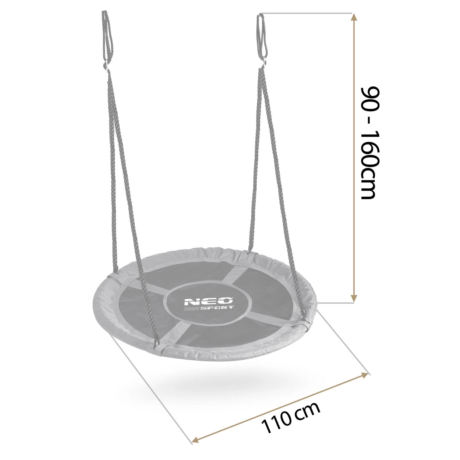 Cuibul balansoar NEO-SPORT Swingo 110 cm este ideal pentru grădină și curte. Șezutul larg și confortabil din țesătură rezistentă, impermeabilă Oxford 600D se curăță ușor și este plăcut la atingere. Structura din oțel acoperită cu spumă PE moale și frânghiile împletite rezistente oferă stabilitate și siguranță pentru copii și adulți.