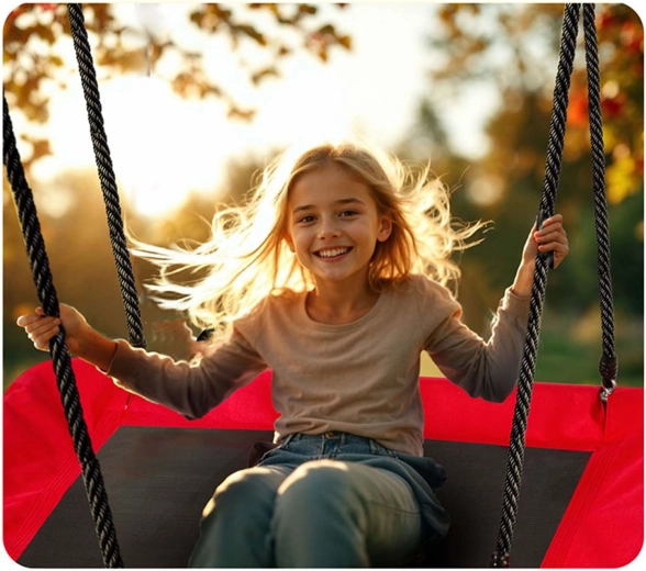 Ajustați lungimea funiilor până la 160 cm pentru a seta înălțimea ideală. Leagănul crește odată cu copiii și suportă până la 150 kg.