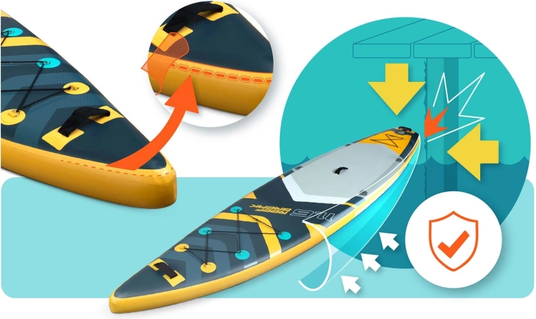 Construcția ușoară, multiplele mânere de prindere și rucsacul rezistent asigură purtare confortabilă. Pompa cu acțiune dublă scurtează timpul de umflare, ca să fii rapid pe apă.