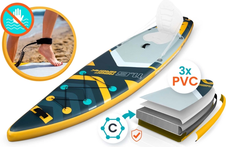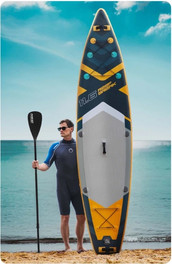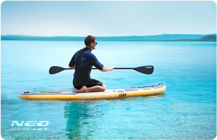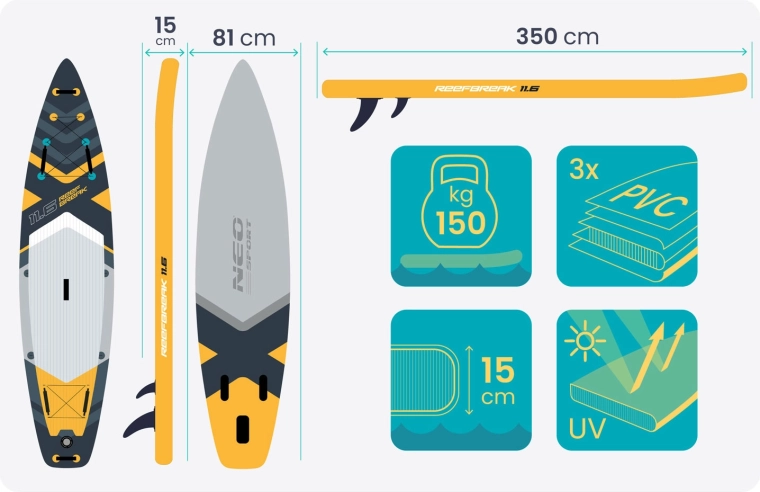 Paddleboardul Reefbreak 11'6 este o alegere perfectă pentru utilizatori recreaționali și avansați care caută siguranță, confort și versatilitate. Datorită grosimii de 15 cm și formei late, oferă stabilitate excelentă pentru ape line, valuri mici și chiar sesiuni de yoga pe apă. Deck-ul EVA antiderapant menține picioarele ferm pe poziție, în timp ce cele 3 aripioare direcționale asigură ghidaj precis și manevrare ușoară.