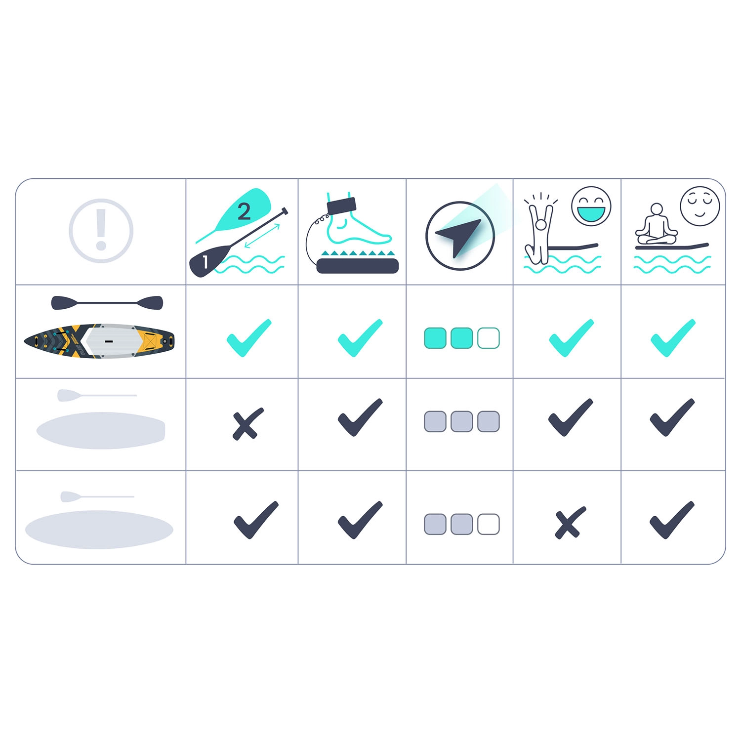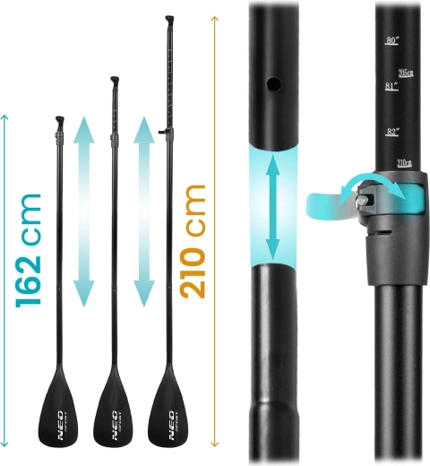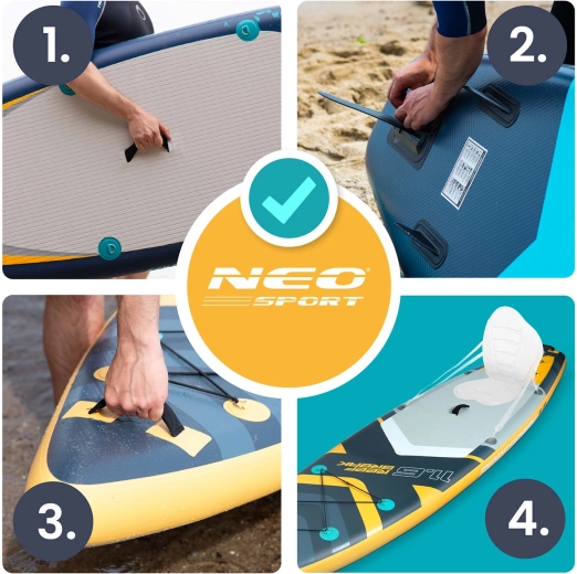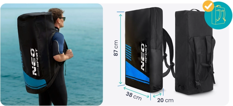 Pachetul include pompă cu acțiune dublă și manometru pentru umflare rapidă și sigură, vâslă din aluminiu reglabilă (162–210 cm) cu sistem de blocare rapidă și leash spirală cu articulație pivotantă pentru libertate de mișcare. Rucsacul rezistent întărit împotriva abraziunii ușurează transportul întregului echipament. Stratul cu rezistență UV și marginile ranforsate prelungesc durata de viață chiar și în utilizare intensivă.