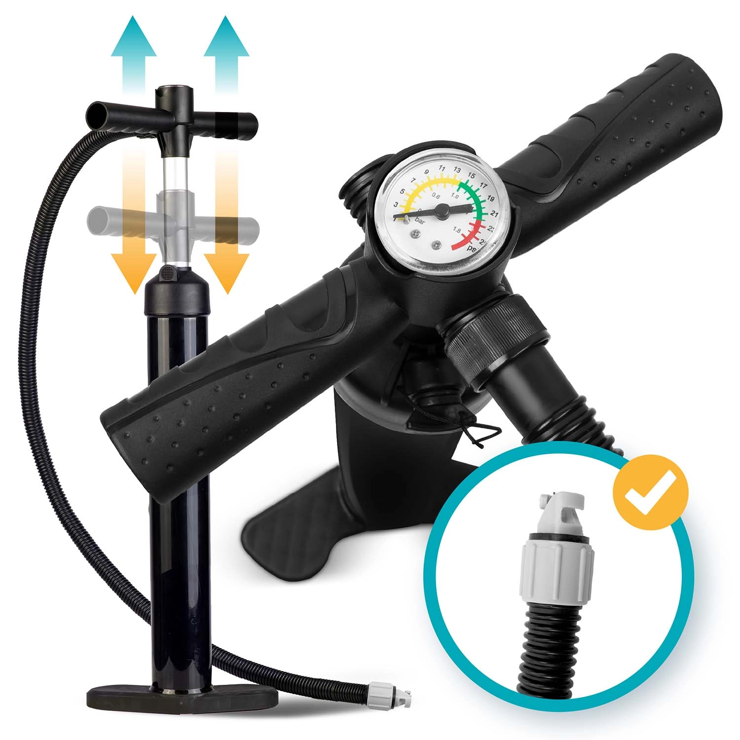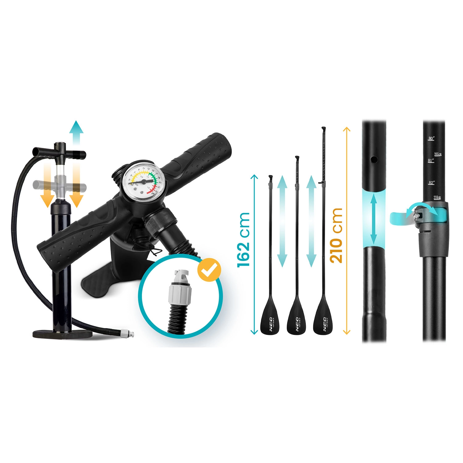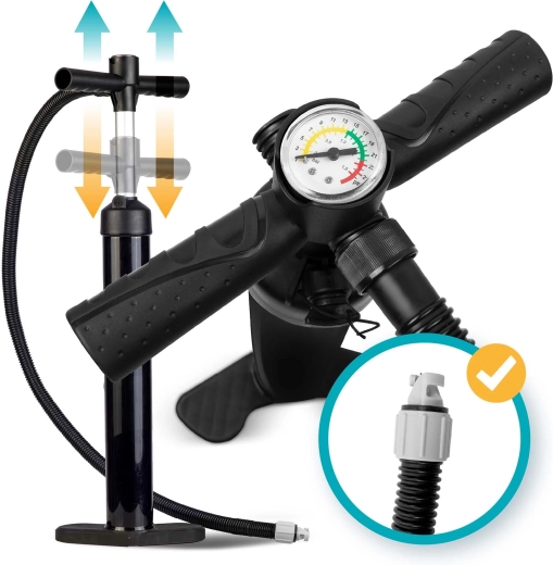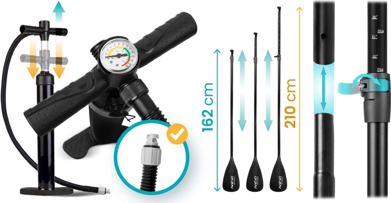 Tot ce ai nevoie într-un singur pachet: vâslă reglabilă, pompă cu acțiune dublă și manometru, leash, aripă, set de reparații și rucsac de transport rezistent. Se umflă rapid, se împachetează ușor și poți porni la drum.
