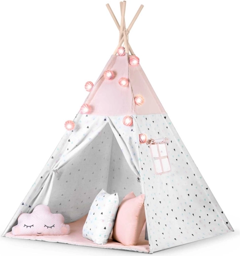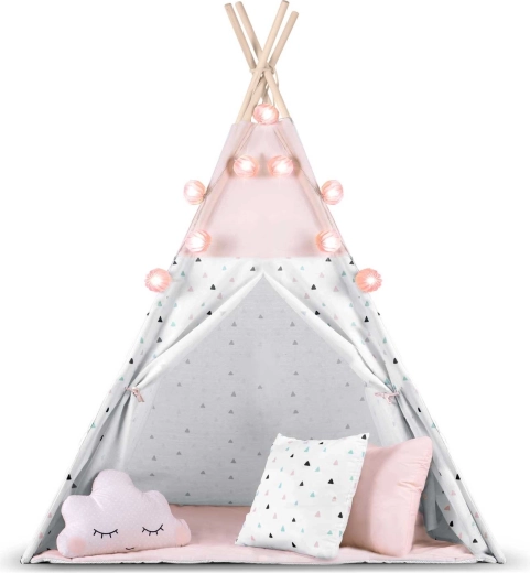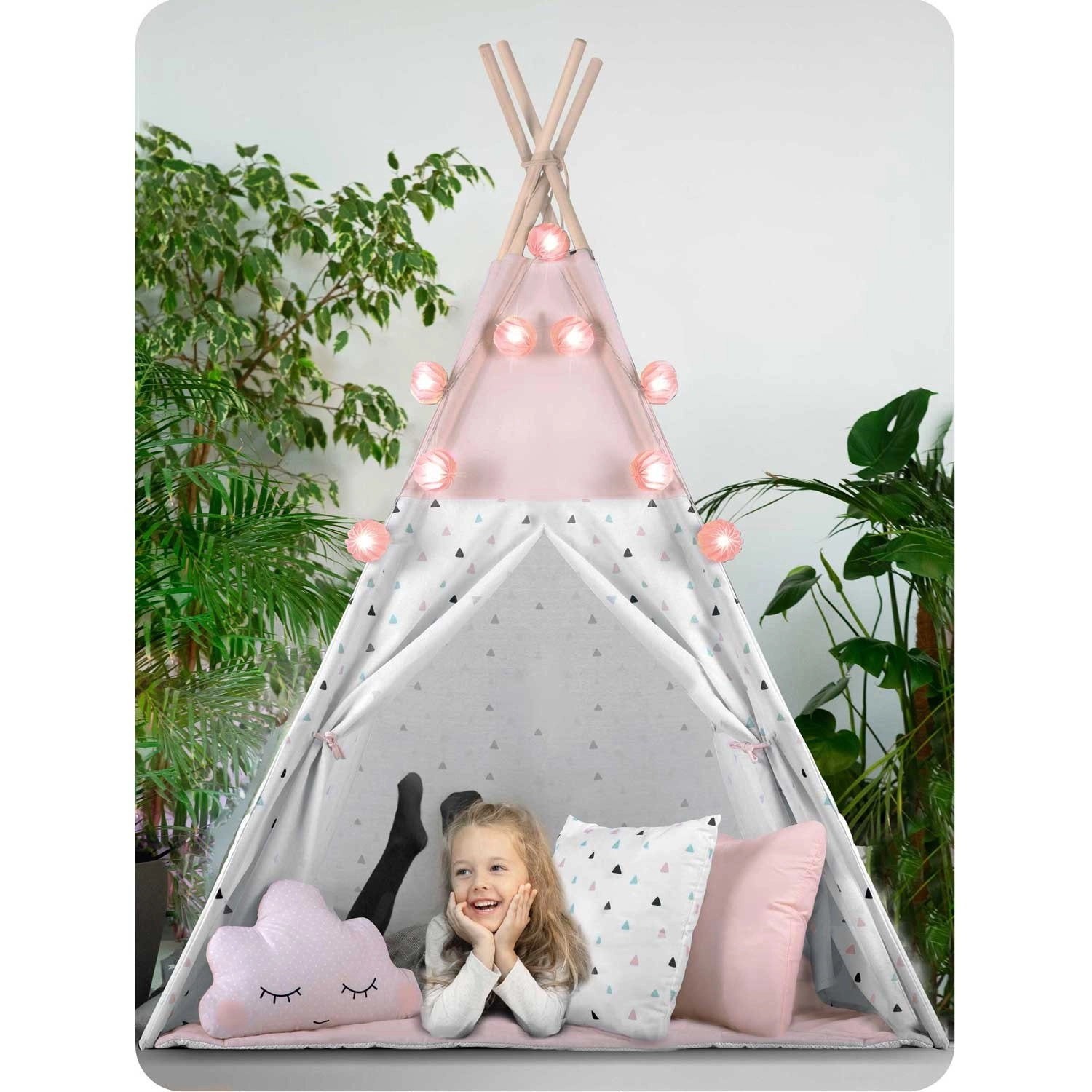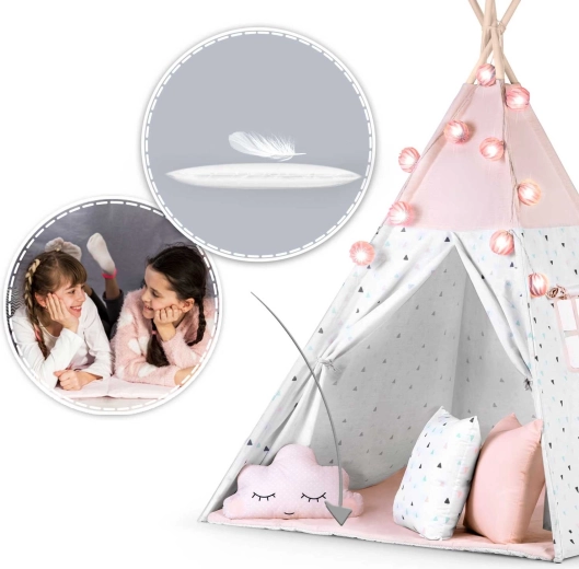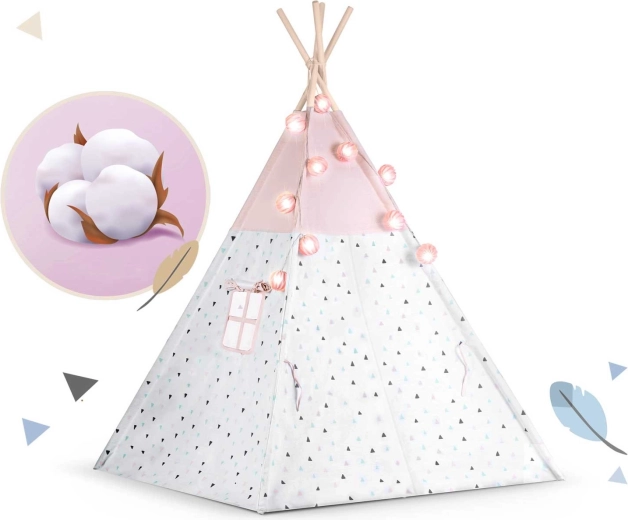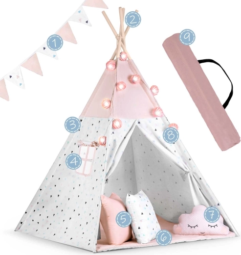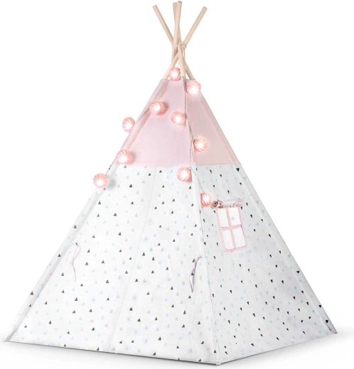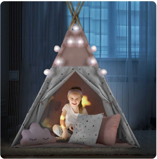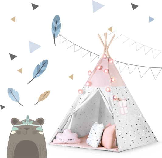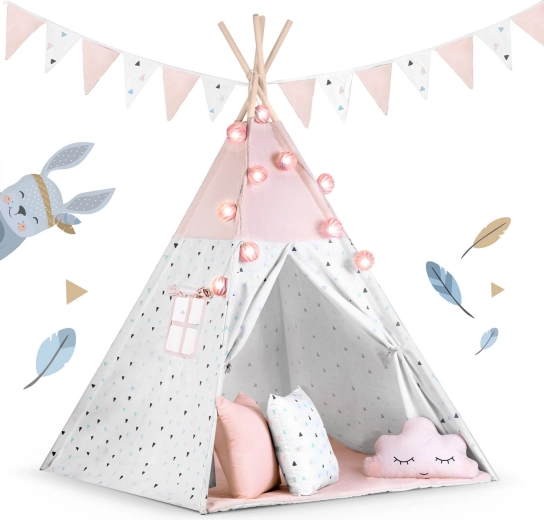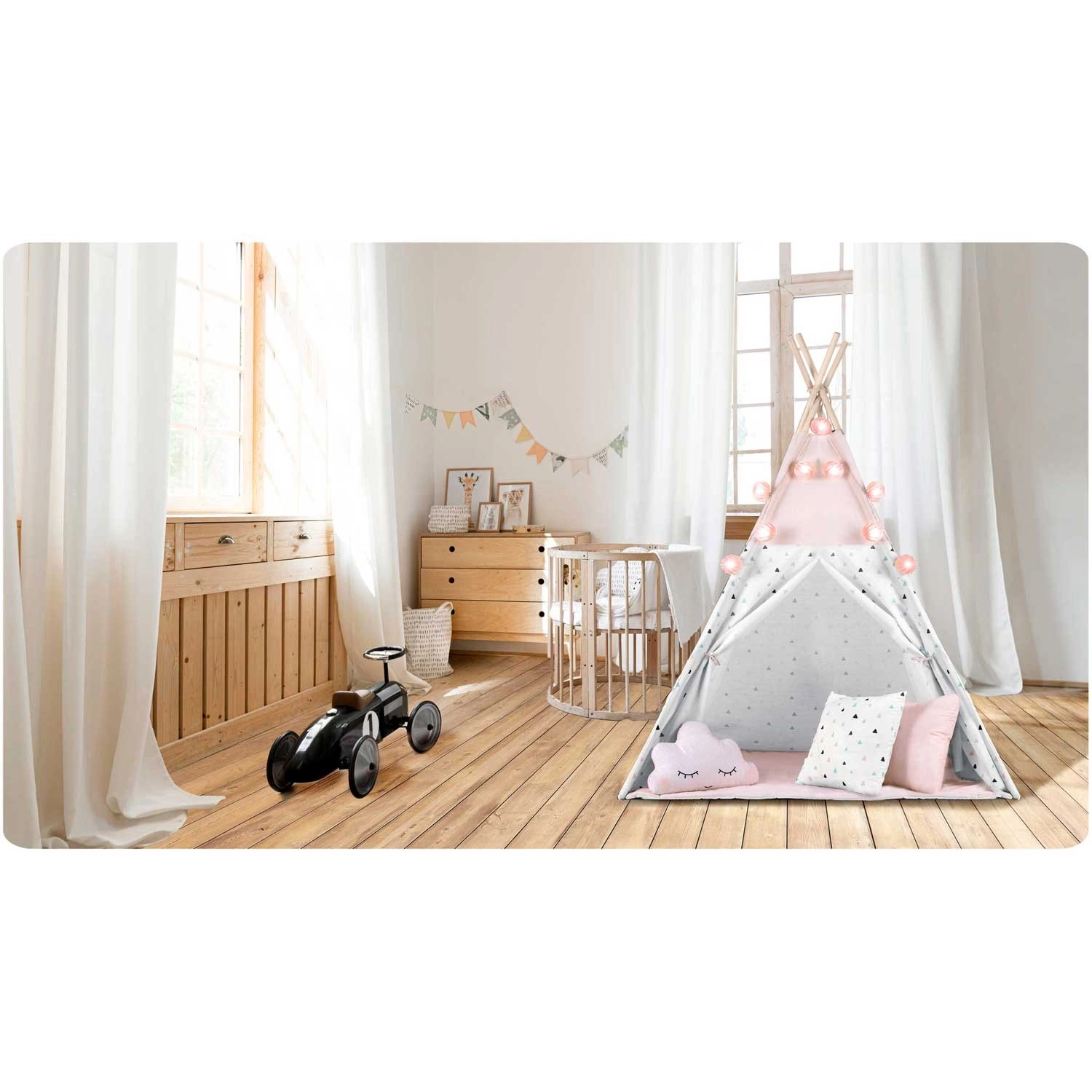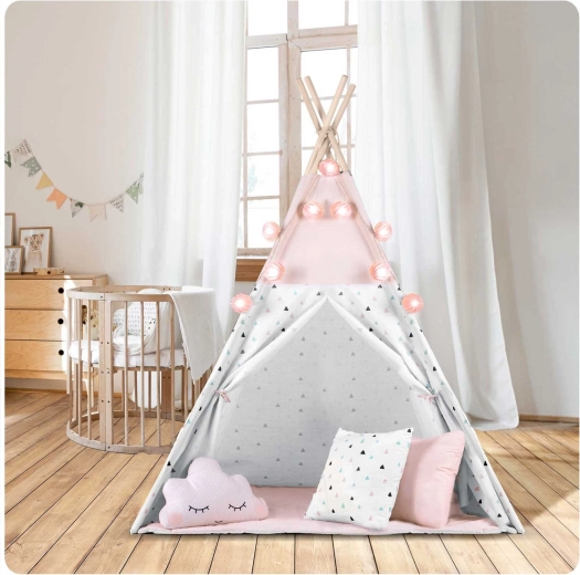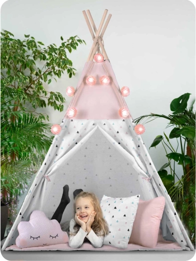 Teepee-ul pentru copii NUKIDO, în tonuri delicate de roz, este vedeta camerelor de copii. Bumbacul premium (175 g/m²) este respirabil, moale, durabil și plăcut la atingere, iar bețele din molid asigură rezistență și longevitate. Datorită asamblării rapide și construcției ușoare, teepee-ul se mută ușor din cameră pe terasă sau în grădină.