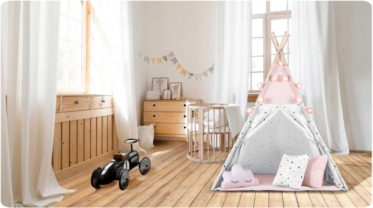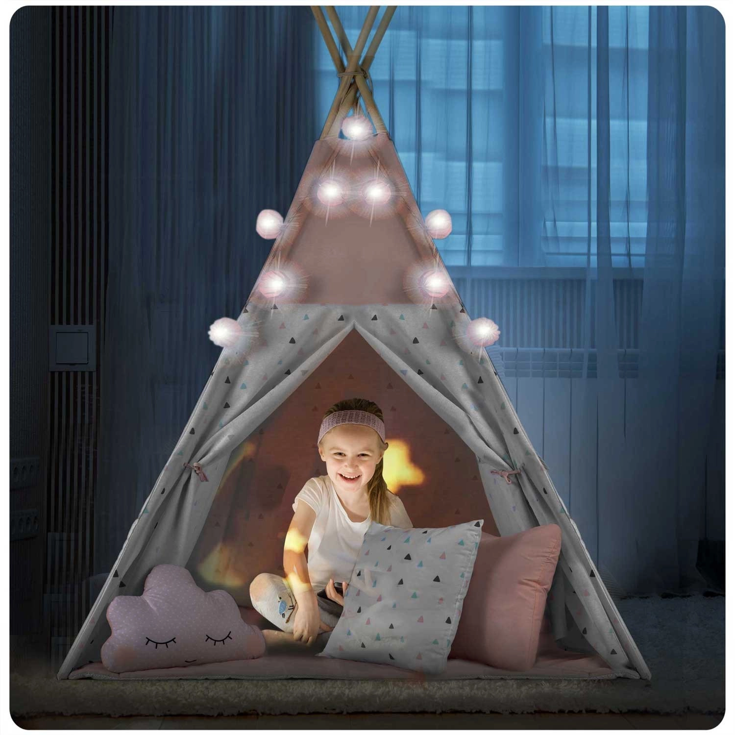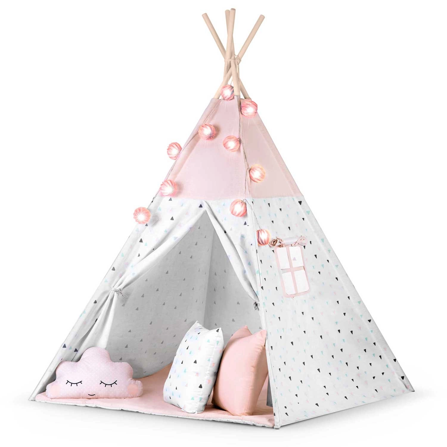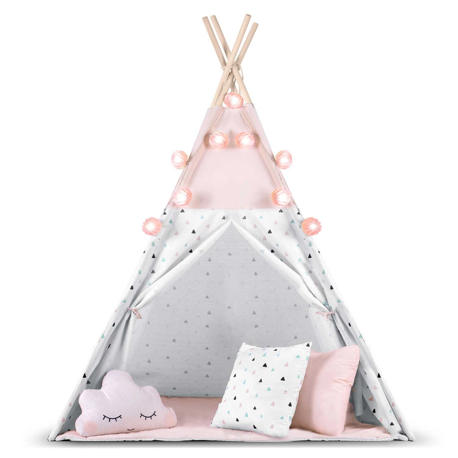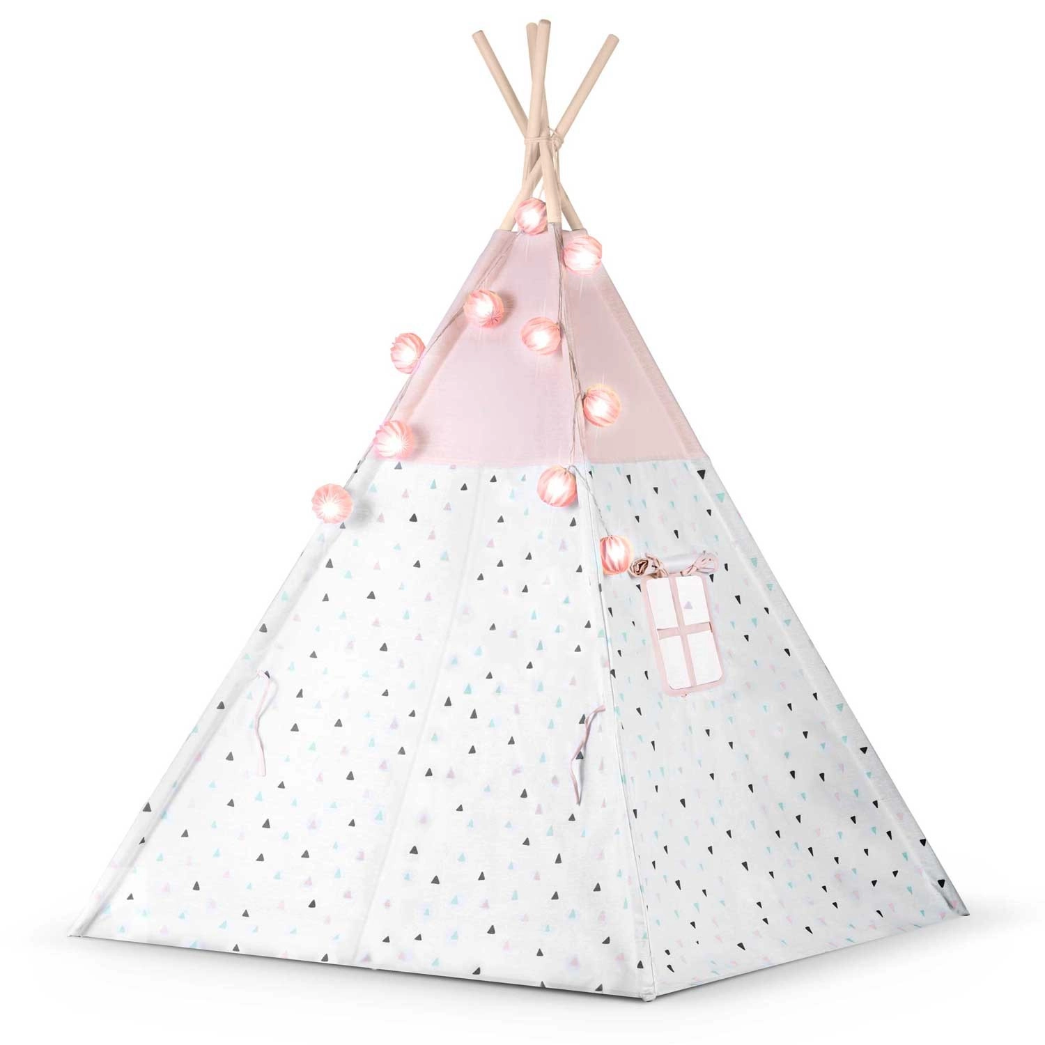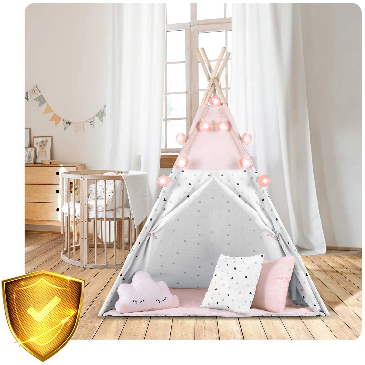 Teepee-ul pentru copii NUKIDO, în tonuri delicate de roz, este vedeta camerelor de copii. Bumbacul premium (175 g/m²) este respirabil, moale, durabil și plăcut la atingere, iar bețele din molid asigură rezistență și longevitate. Datorită asamblării rapide și construcției ușoare, teepee-ul se mută ușor din cameră pe terasă sau în grădină.