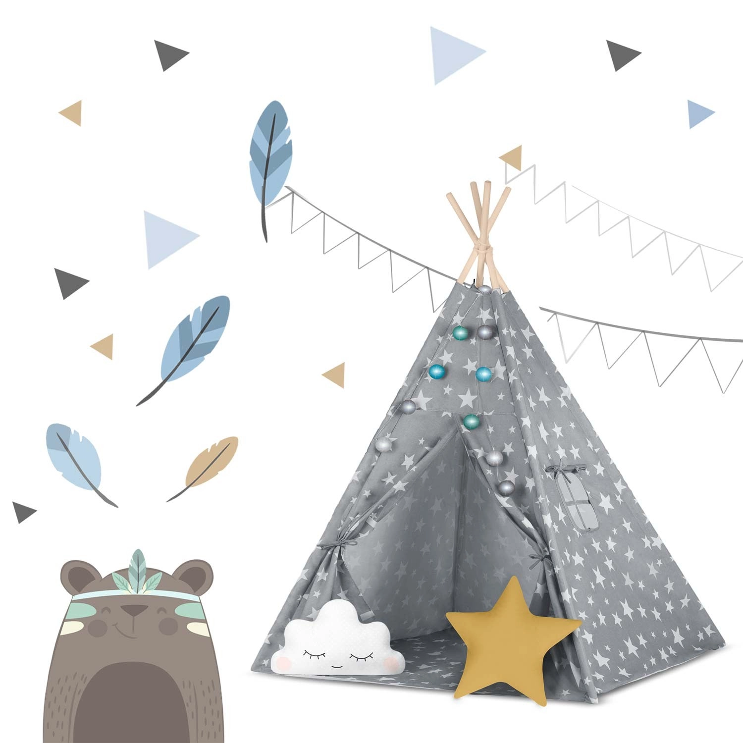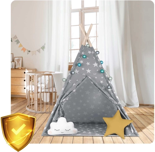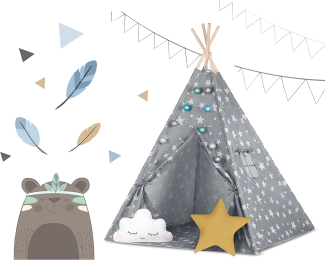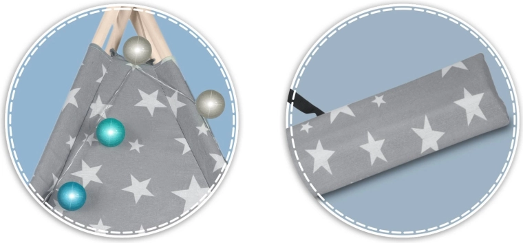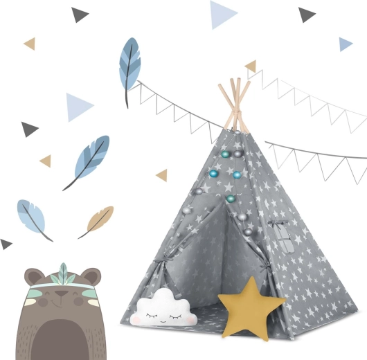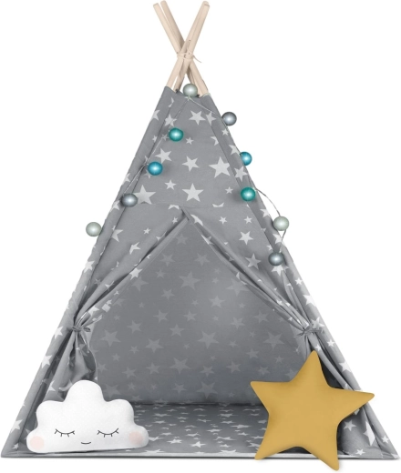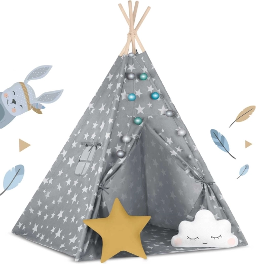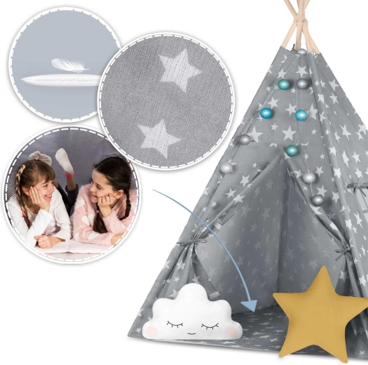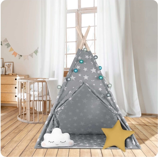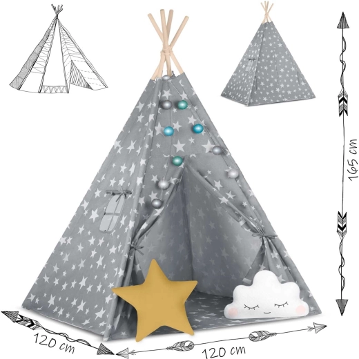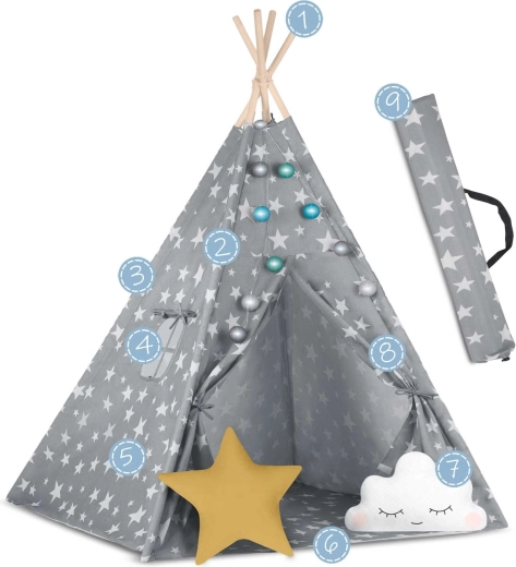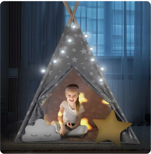 Pachetul conține tot ce aveți nevoie: 4 bețe din pin, stabilizator pentru rezistență suplimentară, luminițe LED (pe baterii), saltea cusută, 2 pernuțe moi în formă de nor și stea, fereastră cu roletă și husă practică pentru transport. Teepee-ul se montează și se mută ușor – perfect pentru camera copilului, colțul de joacă sau în grădină, la umbră.