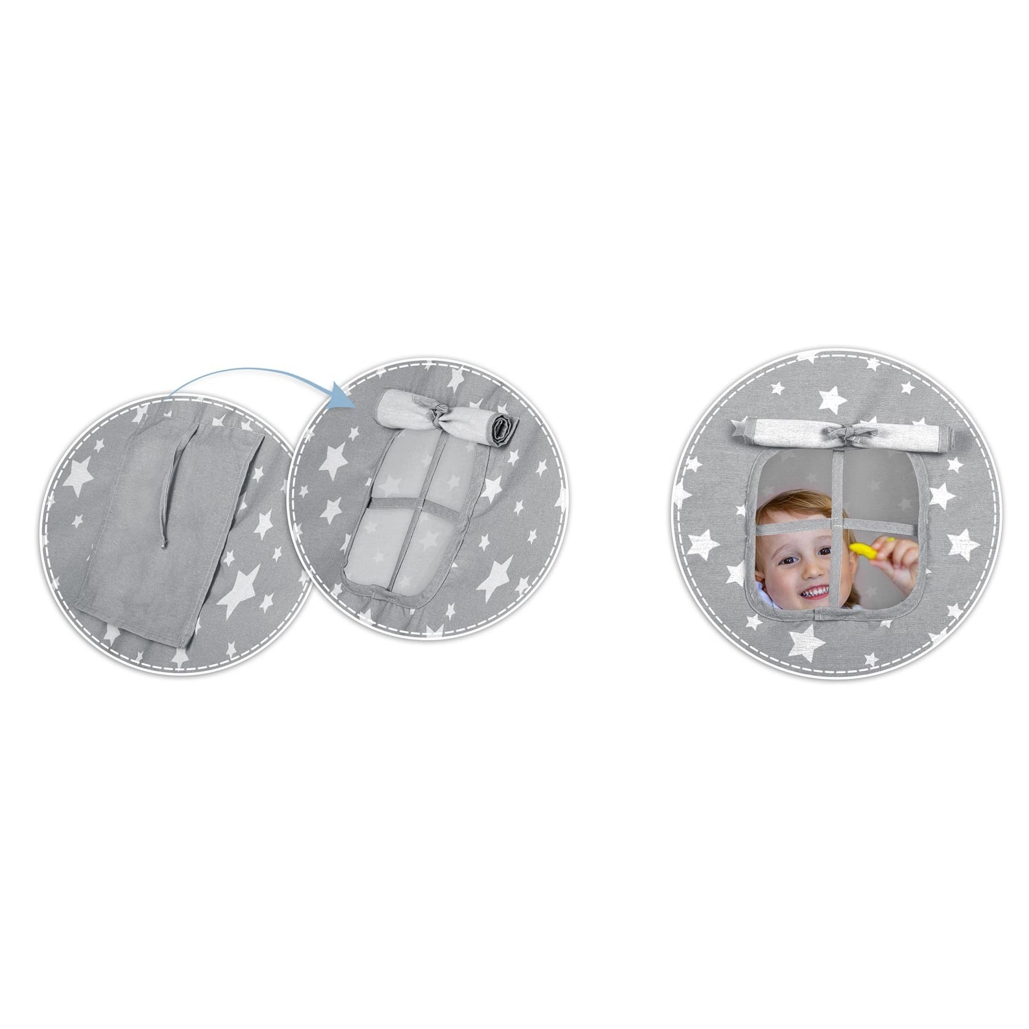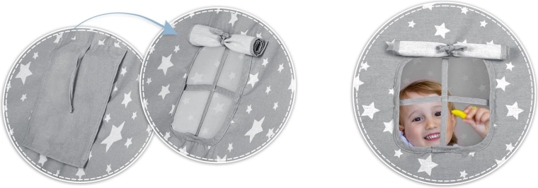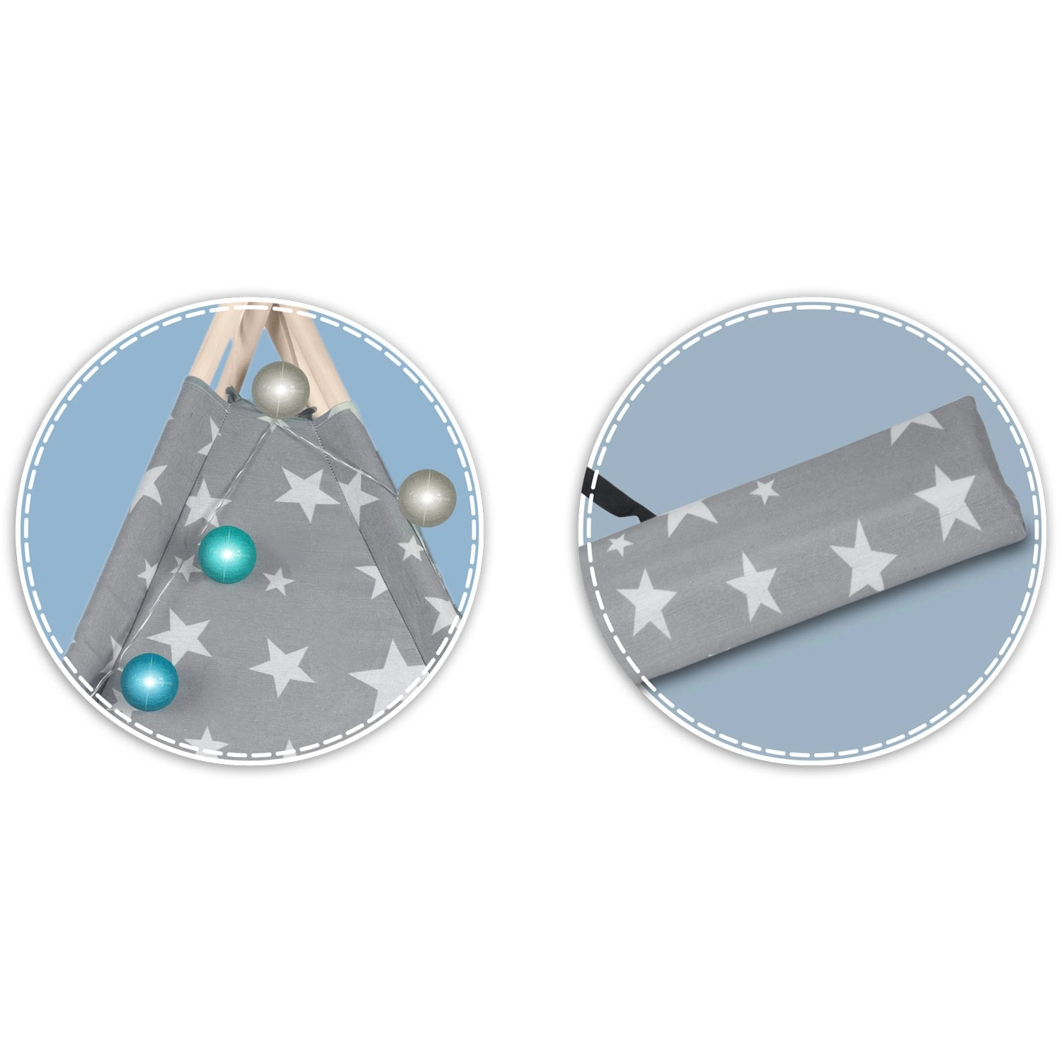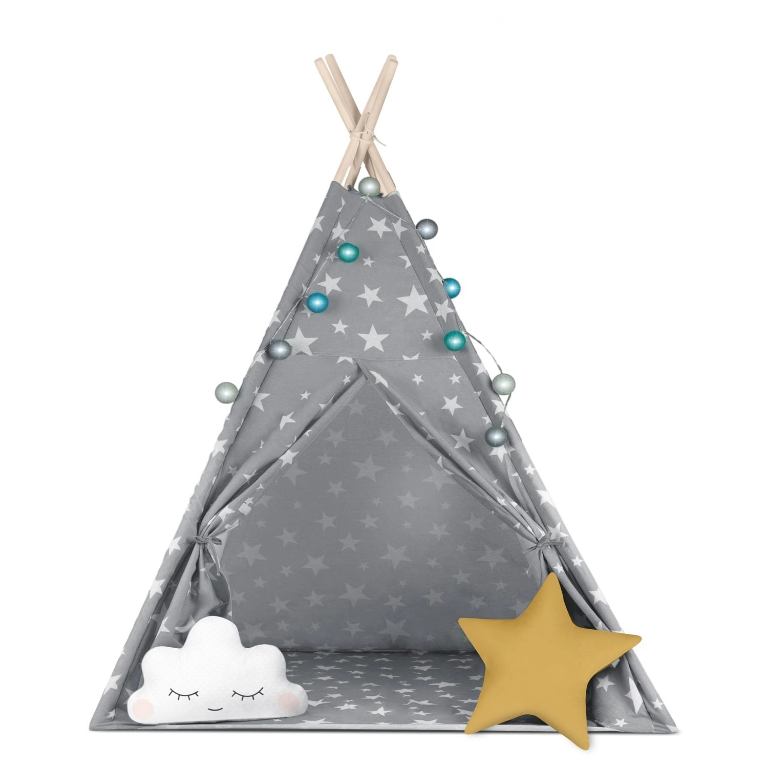 Pachetul conține tot ce aveți nevoie: 4 bețe din pin, stabilizator pentru rezistență suplimentară, luminițe LED (pe baterii), saltea cusută, 2 pernuțe moi în formă de nor și stea, fereastră cu roletă și husă practică pentru transport. Teepee-ul se montează și se mută ușor – perfect pentru camera copilului, colțul de joacă sau în grădină, la umbră.