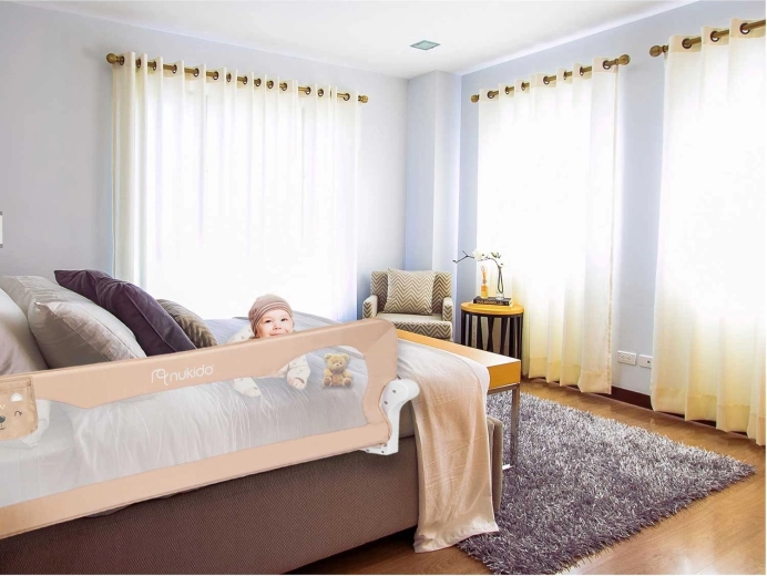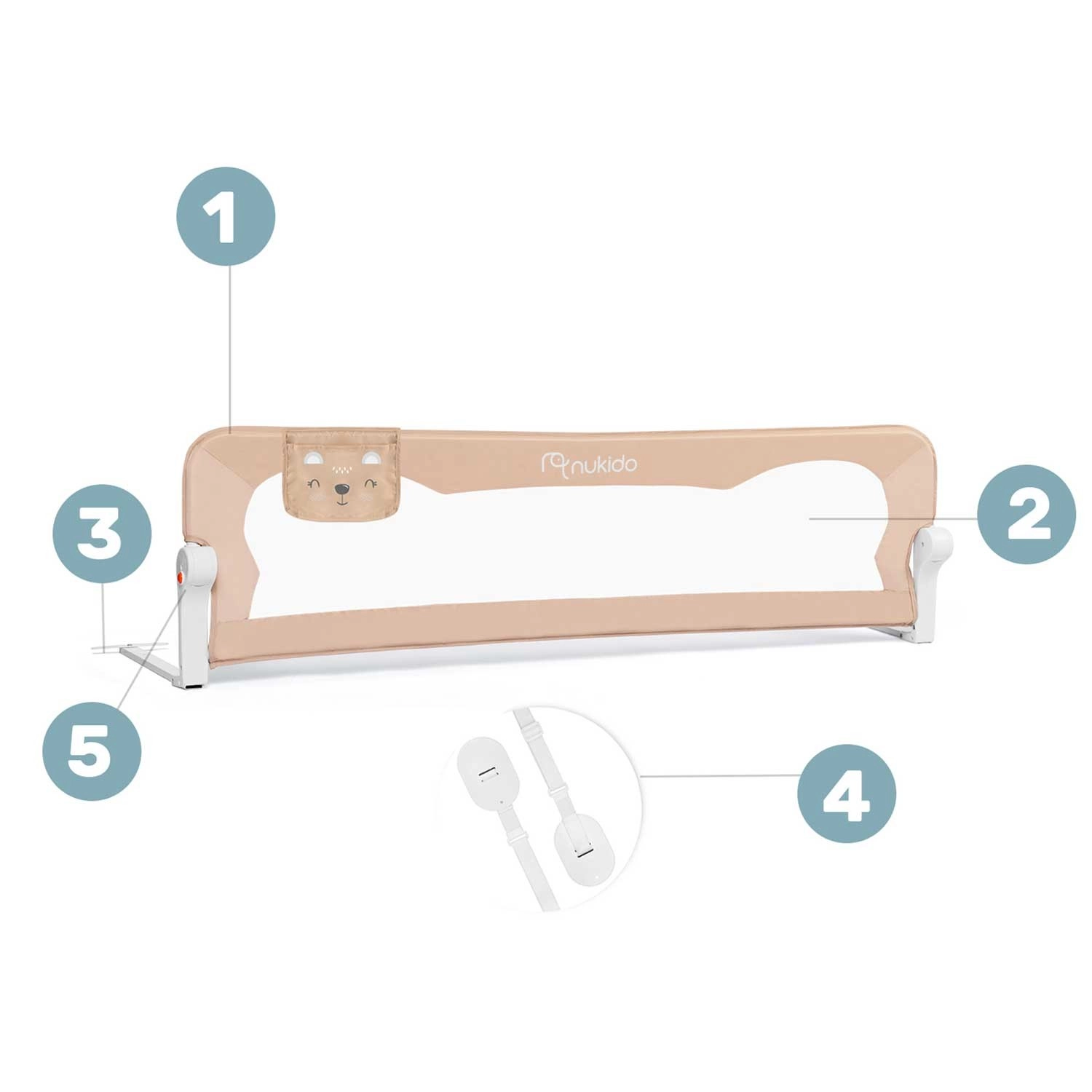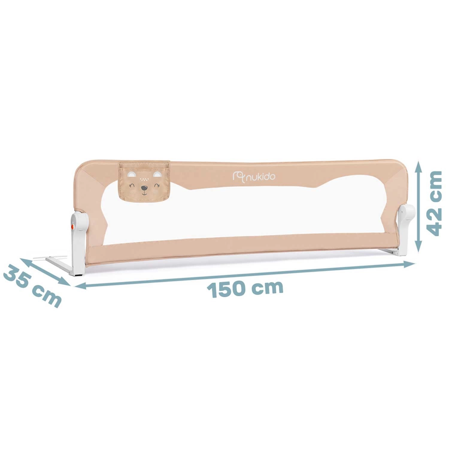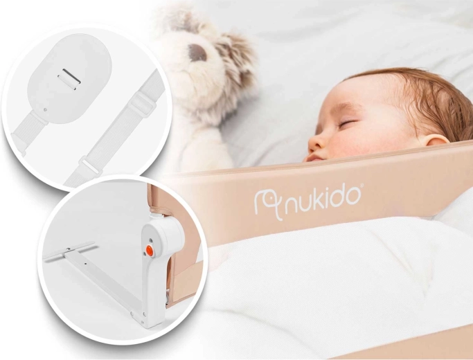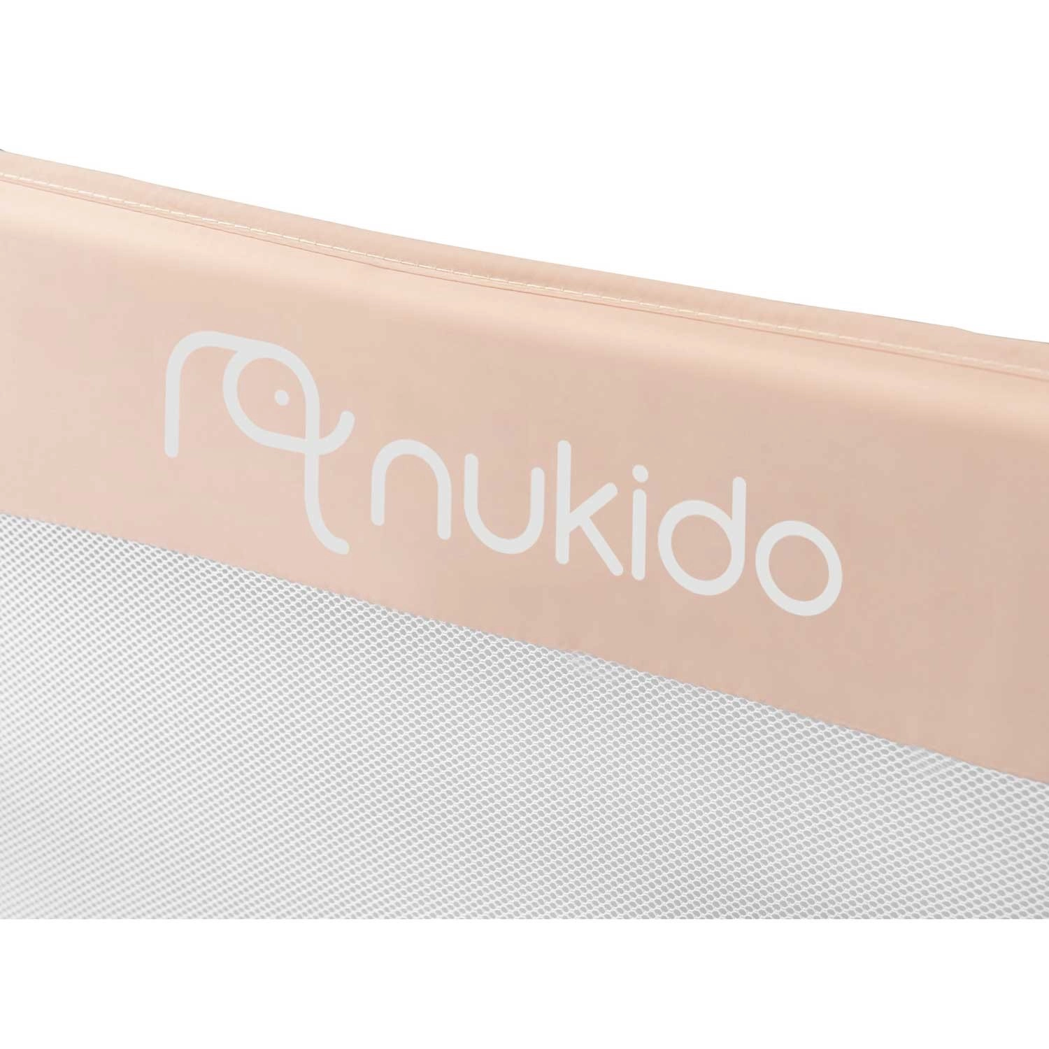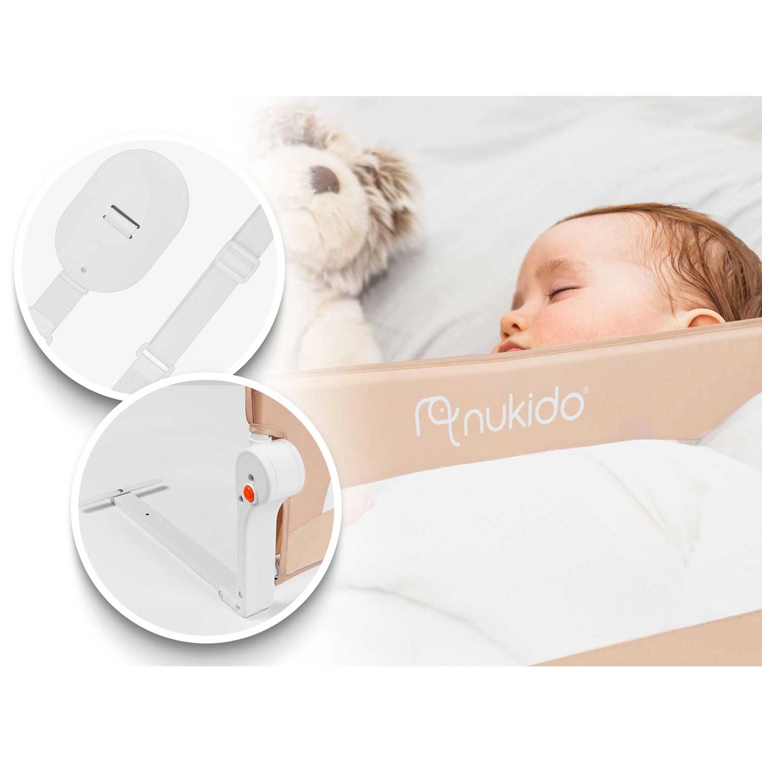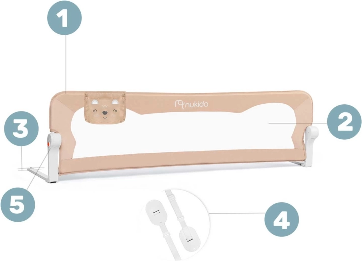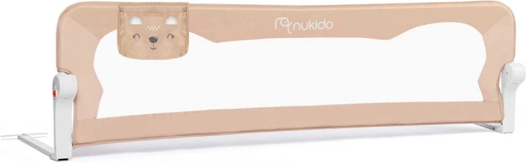 Bariera practică pentru pat pentru copii NUKIDO, în culoarea bej, oferă protecție fiabilă împotriva căderii și, în același timp, asigură vizibilitate datorită plasei respirabile. Structura durabilă din oțel, rabatare până la 180°, curelele de siguranță SafetyBelt și blocarea de siguranță împotriva plierii accidentale garantează siguranță maximă și utilizare confortabilă. Include o buzunar frontal practic pentru suzetă sau mărunțișuri. Conformă cu standardul BS 7972:2001+A1:2009.