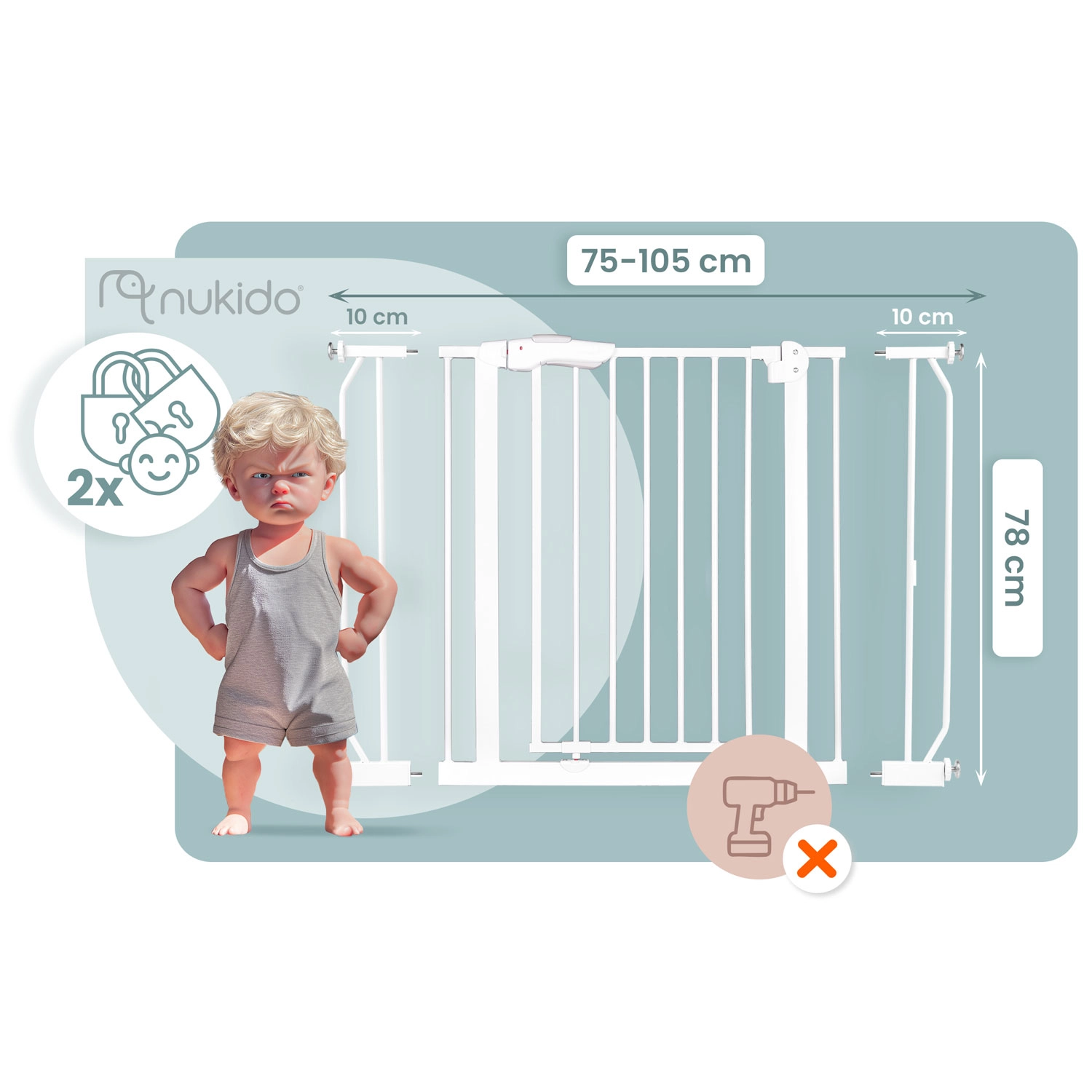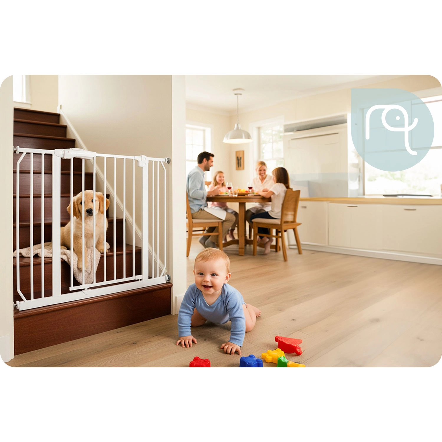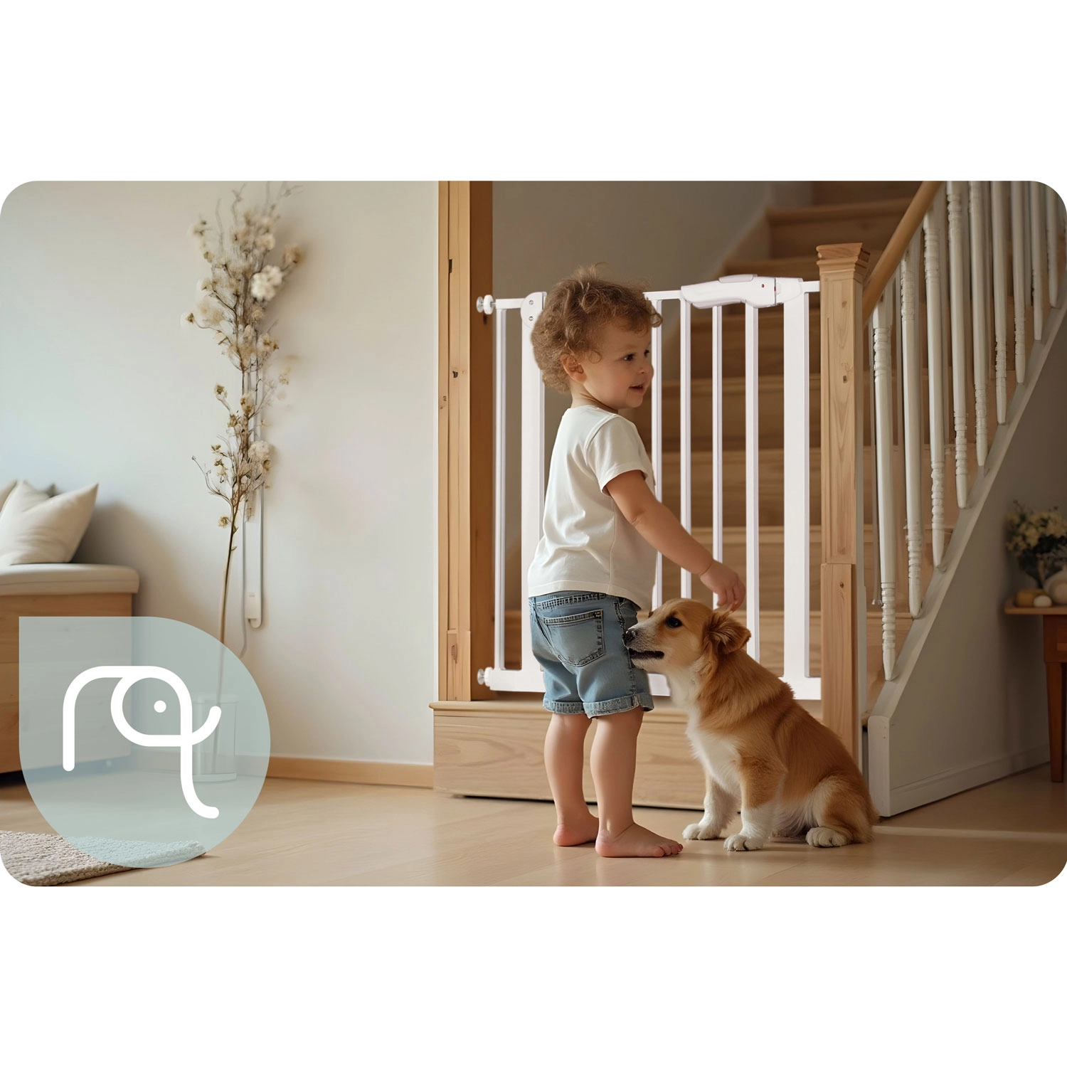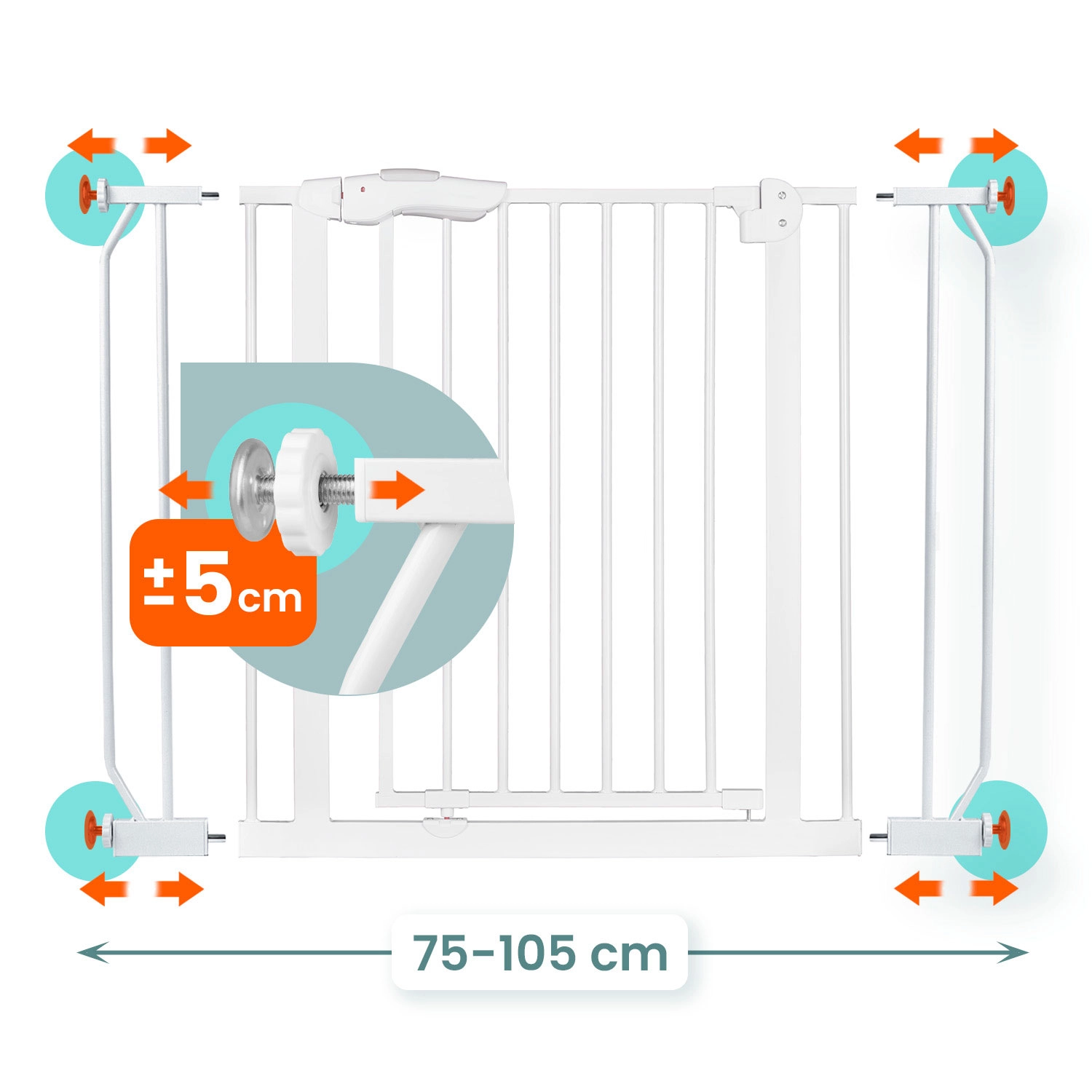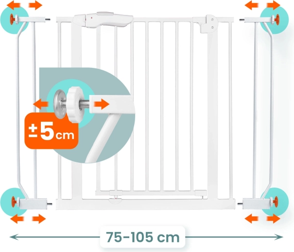 Pachetul include extensii și reglatoare de lățime, datorită cărora ajustați cu ușurință bariera pentru deschideri de 75–105 cm. Ideală pentru uși și pentru începutul sau capătul scărilor.